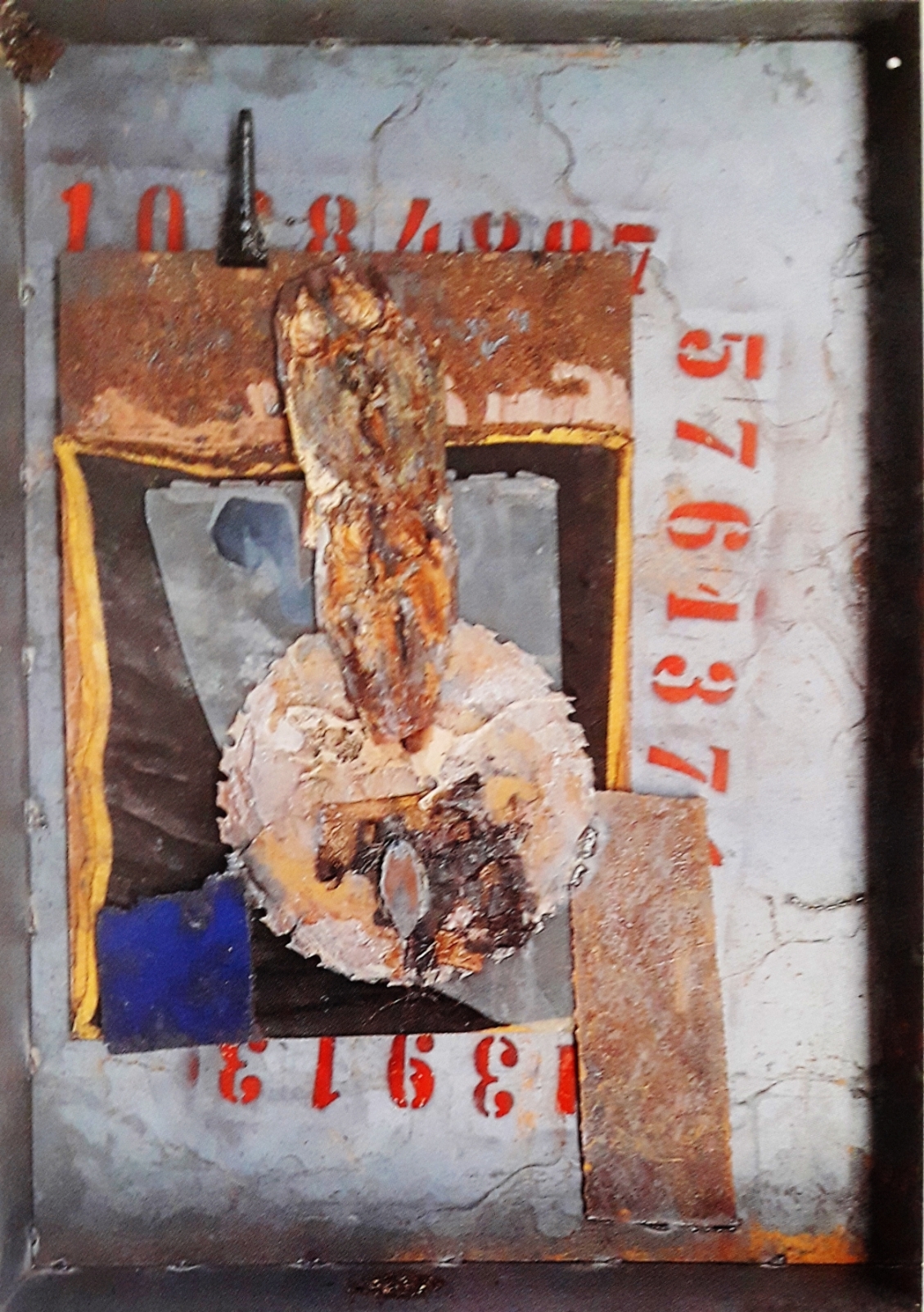DE CHIRICO JAKOB Innsbruck 1943 “Senza titolo” acrilici e assemblaggio di oggetti di recupero e stoffe in teca di acciaio cm 80x110x20 di spessore. Opera pubblicata a piena pagina del catalogo Makela”