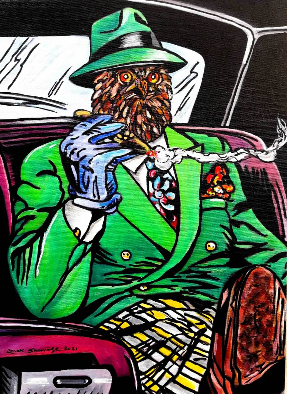 MAX HAMLET SAUVAGE Lecce 1950 "Il boss nella lemousine" acrilico su tela cm 49x34 del 2021. Firmato e datato sul fronte in basso a sinistra. Sul retro firma titolo ed etichetta descrittiva. Autentica e archivio su foto a cura dell’artista.