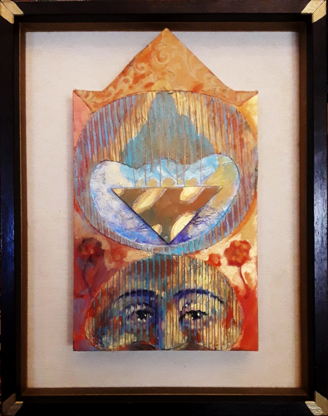 CECCOBELLI BRUNO Terni 1952 “Protetto diletto” tecnica mista su cartone e legno con collage di stoffe, cartoni e legni cm 25x35x4,5 H. Sul retro ideogramma e titolo. Autentica e archiviazione su foto a cura dell’artista.