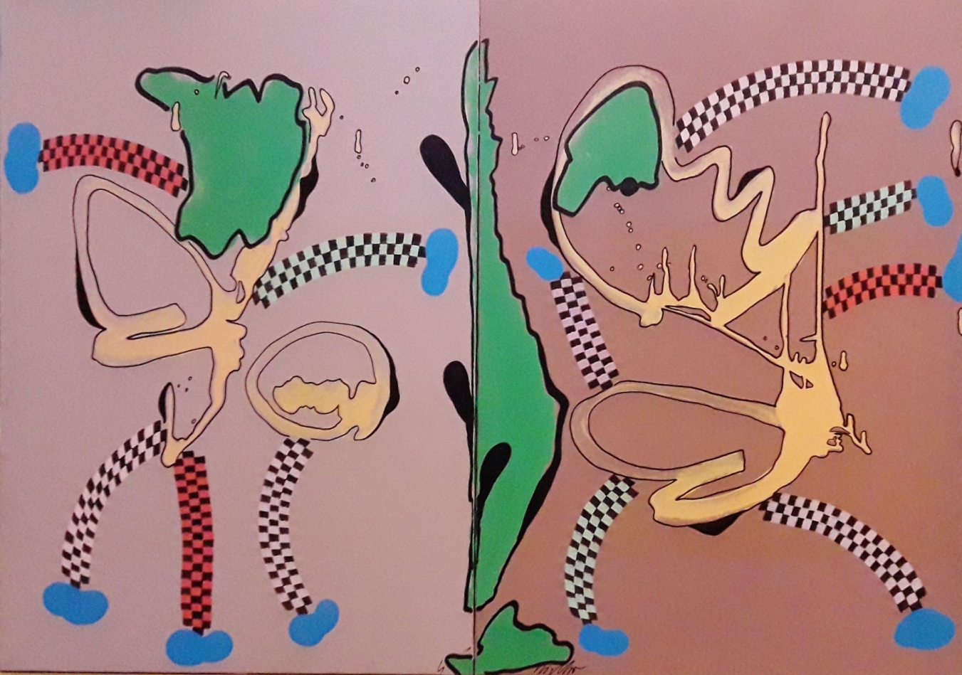 DANGELO SERGIO Milano 1932 “Rythm a ning” acrilico, collage e applicazioni di oggetti, dittico cm 140x100(due tele di cm 70x100 l’una) del1985. Firmato sul fronte al centro nel mezzo. Sul retro intitolato. Si ringrazia il maestro per la conferma e l’autentica su foto.