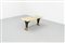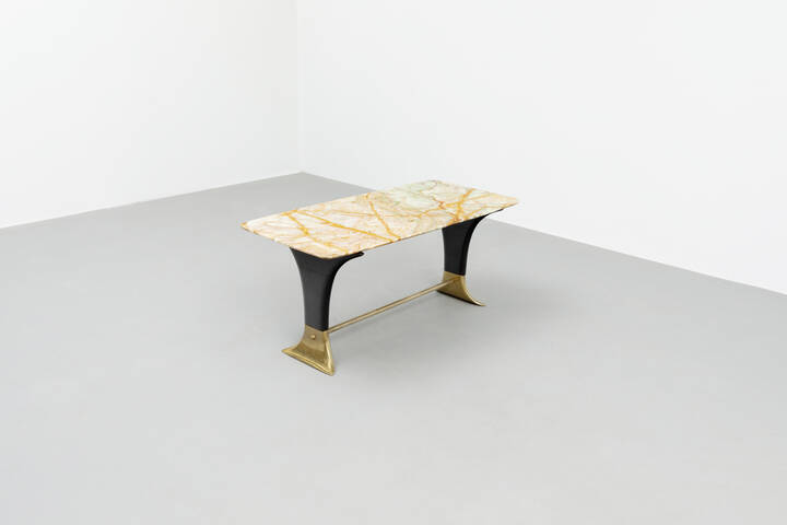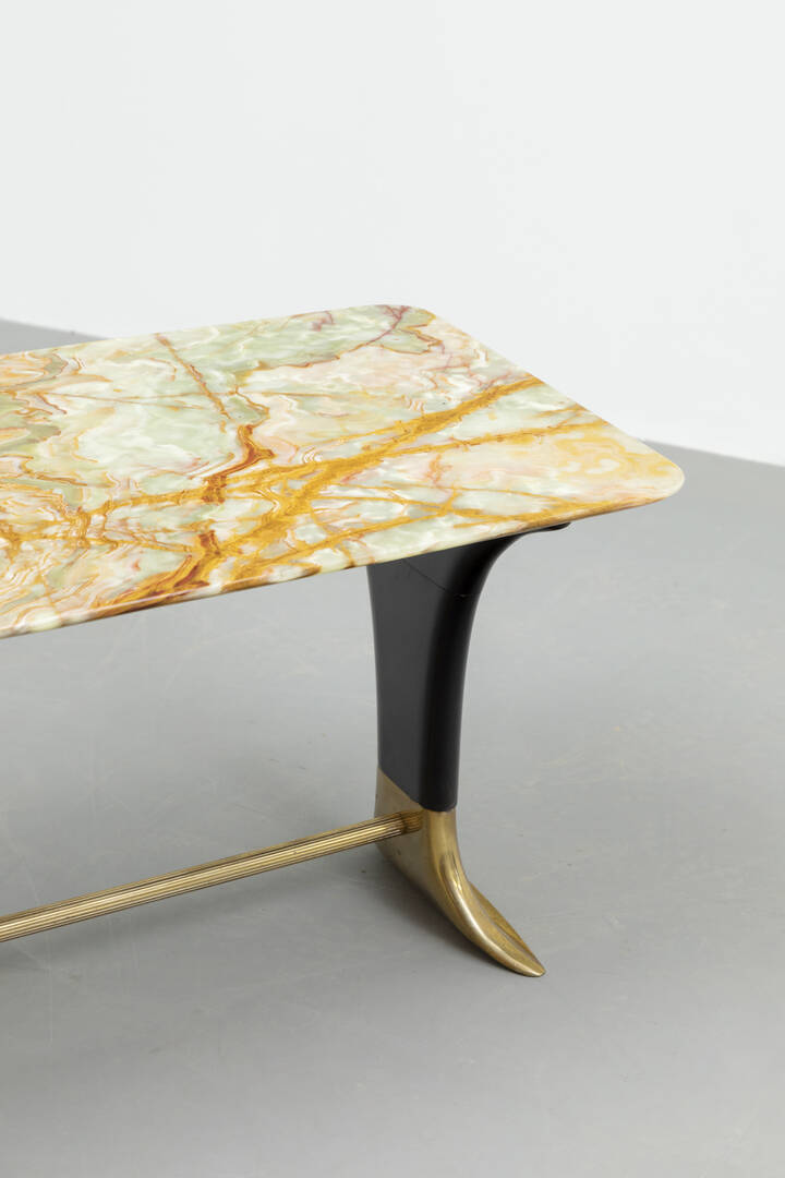 Tavolino con struttura in legno e ottone, piano in marmo.