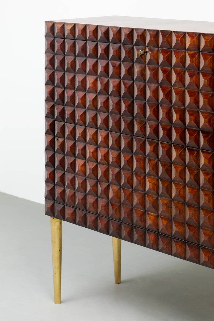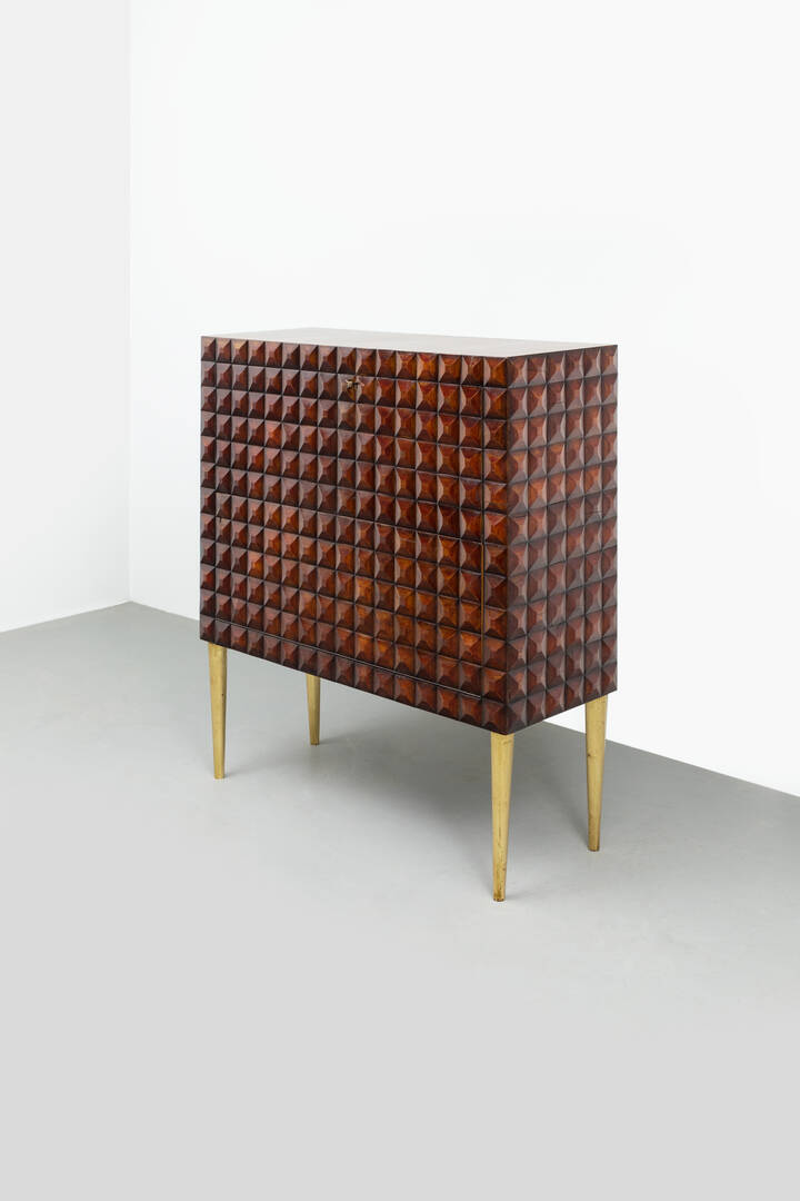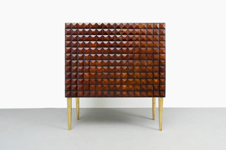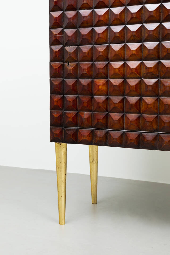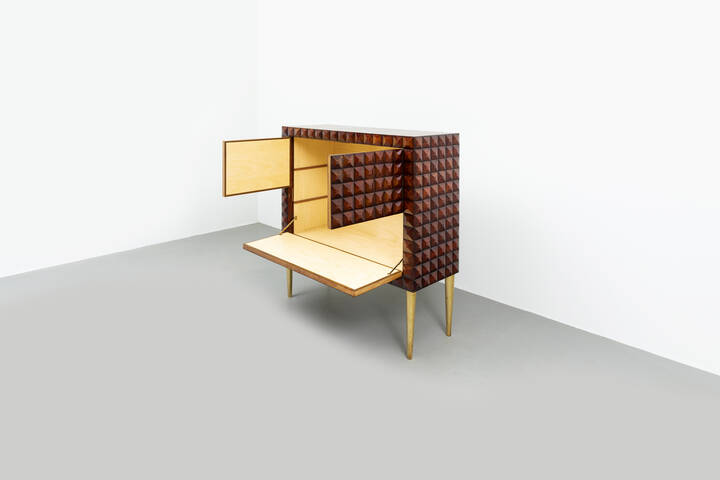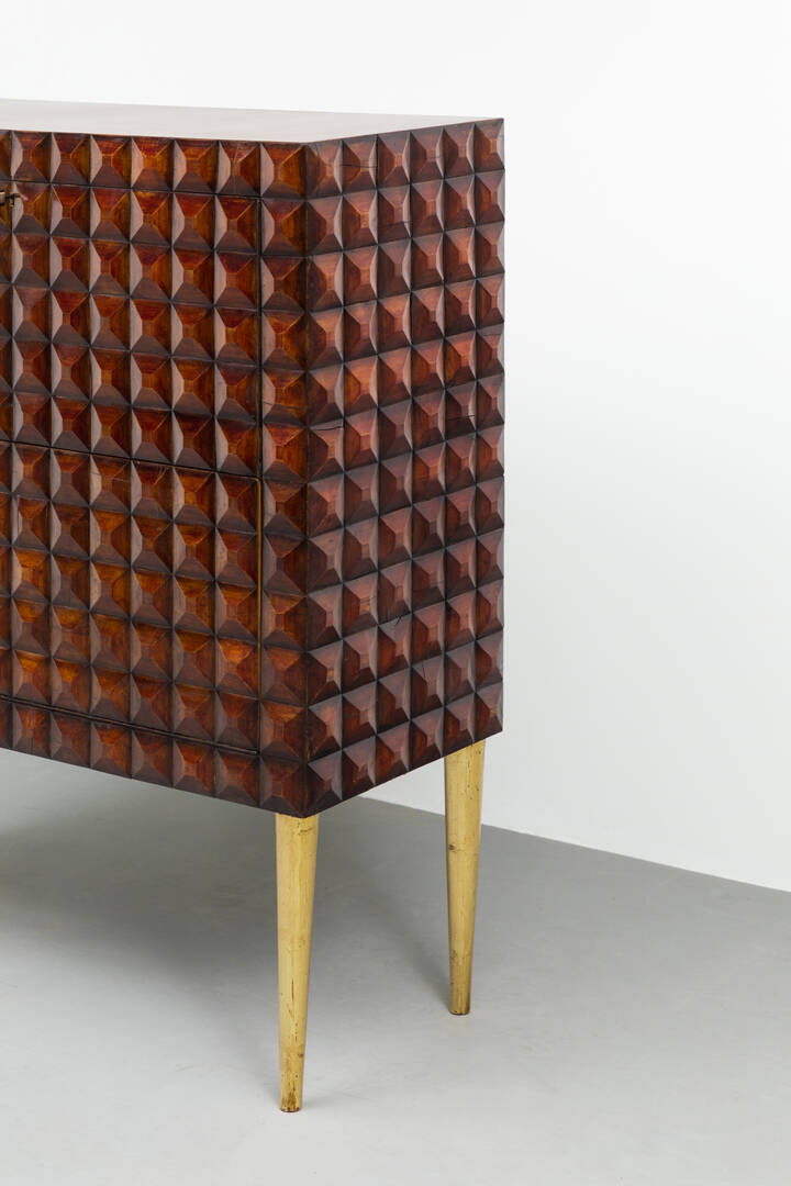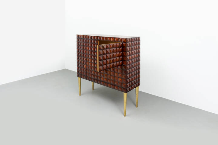 Mobile bar in legno di noce tinto mogano, fronte e fianchi con decoro bugnato, gambe in legno dorato.
