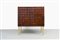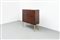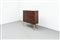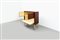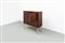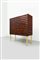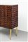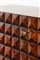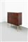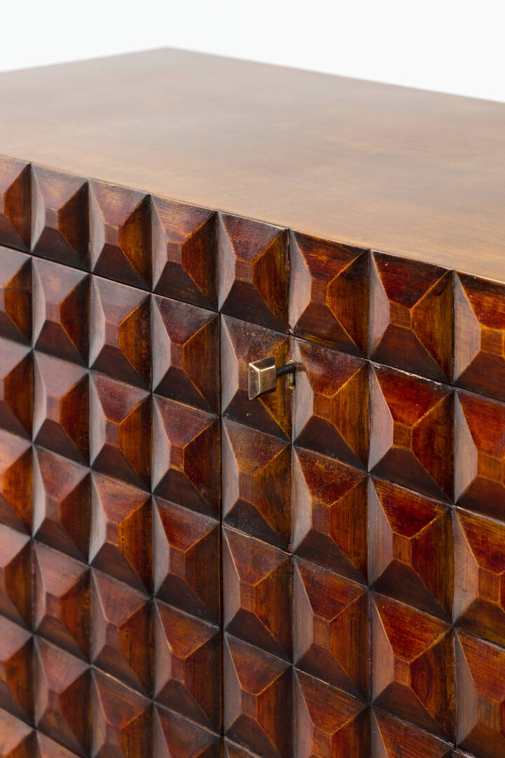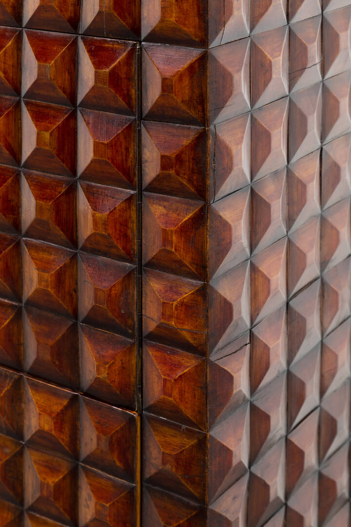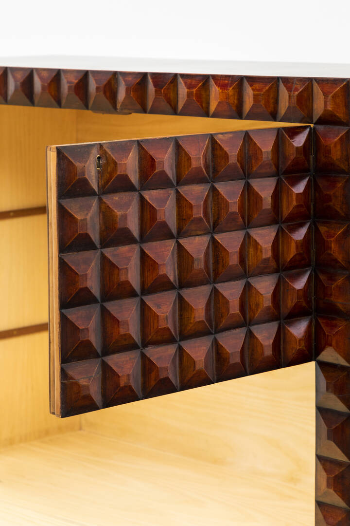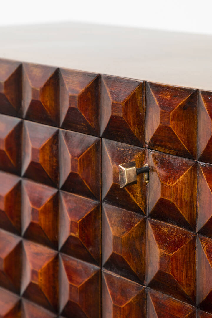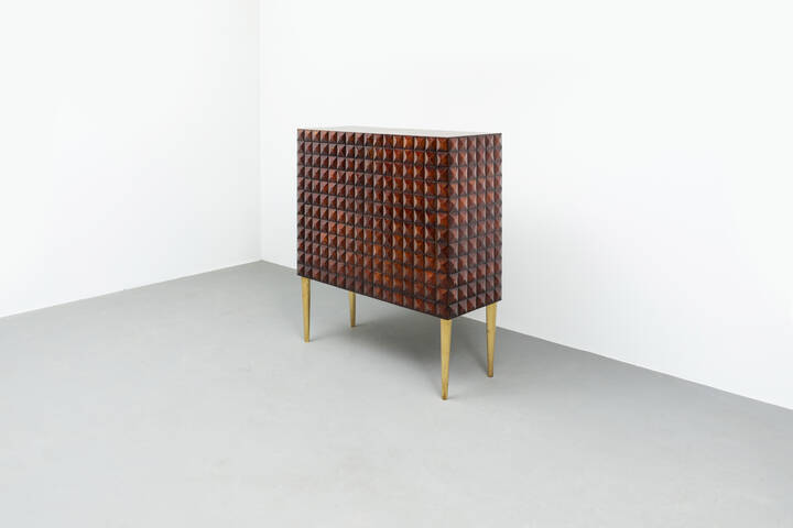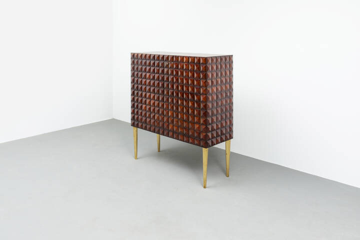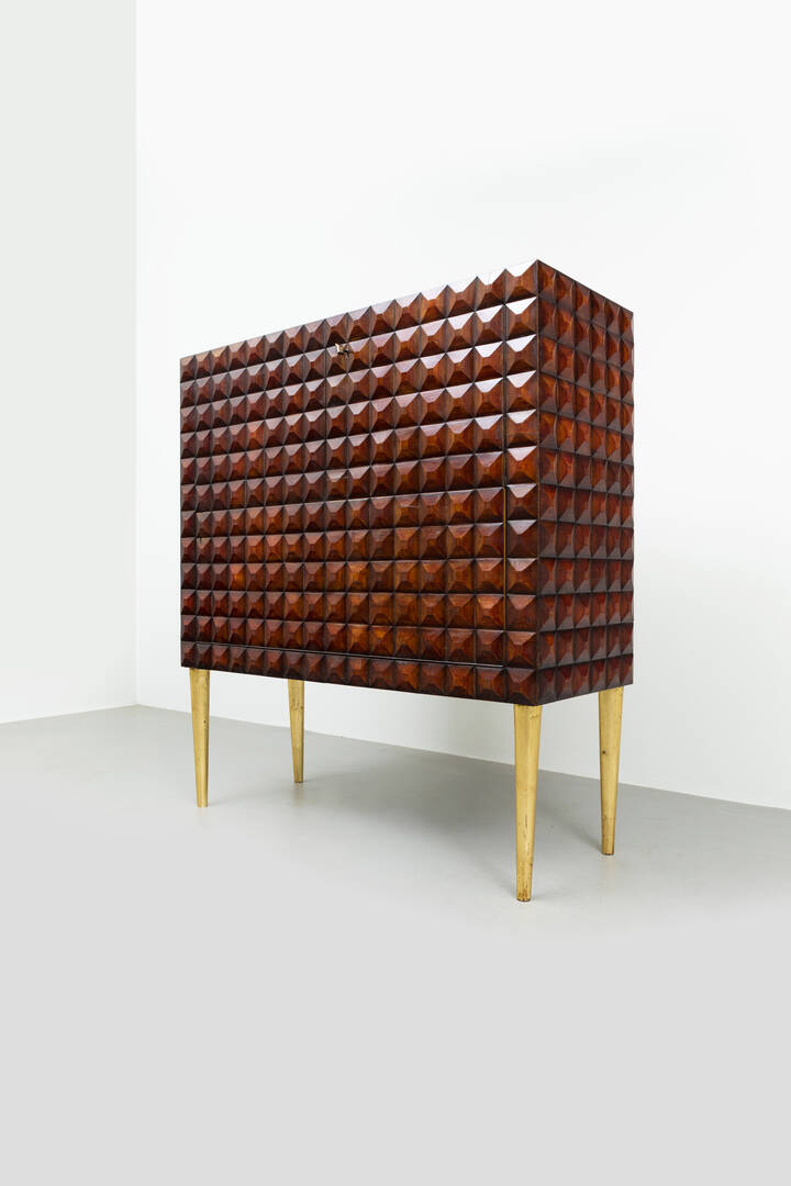 Mobile bar in legno di noce tinto mogano, fronte e fianchi con decoro bugnato, gambe in legno dorato.