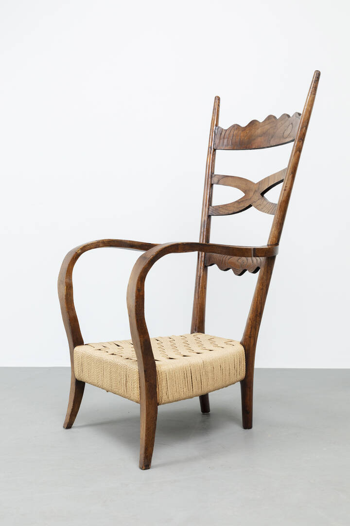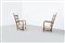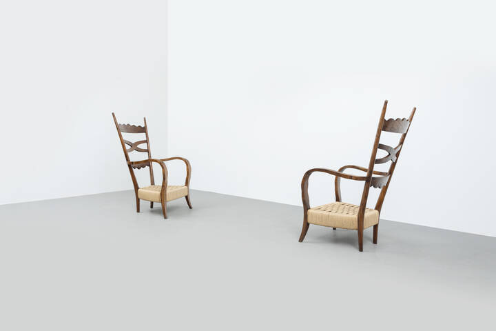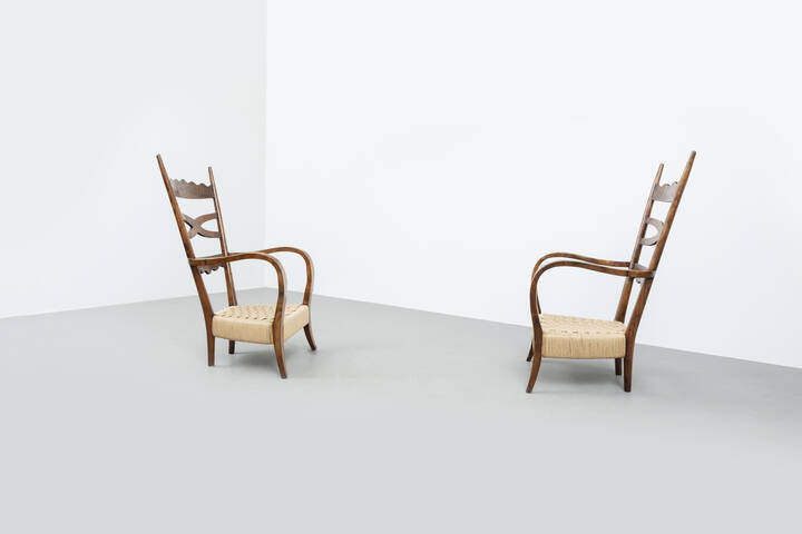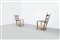 Coppia di sedie con struttura in legno, sedili in paglia intrecciata.