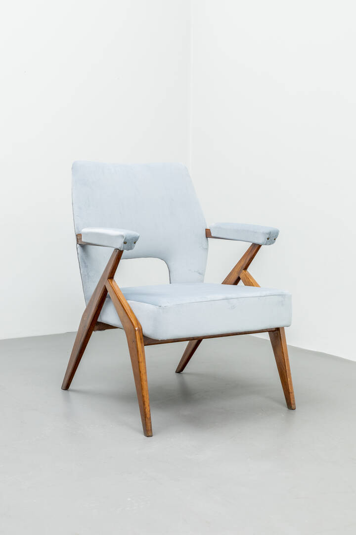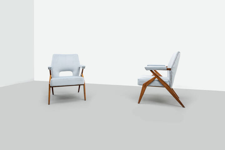 Coppia di poltrone con struttura in legno, imbottitura rivestita in velluto.