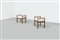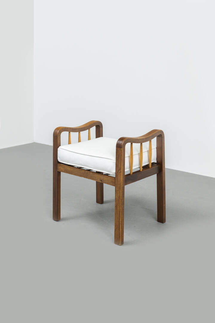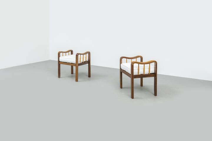 Coppia di sgabelli con struttura in legno, cuscini imbottiti rivestiti in velluto.