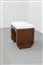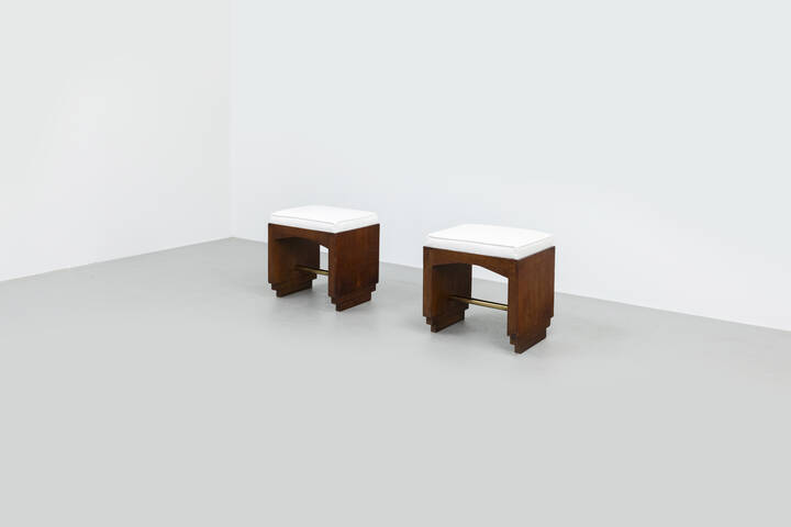 Coppia di sgabelli in legno, imbottitura rivestita in tessuto, particolari in ottone.