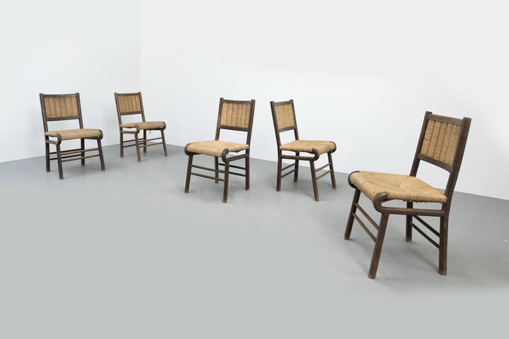 Cinque sedie con struttura in legno, sedili in paglia intrecciata.