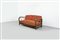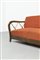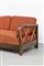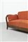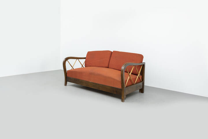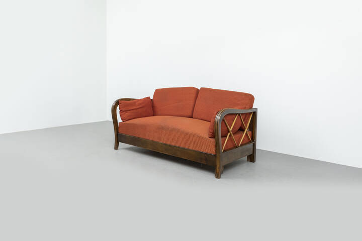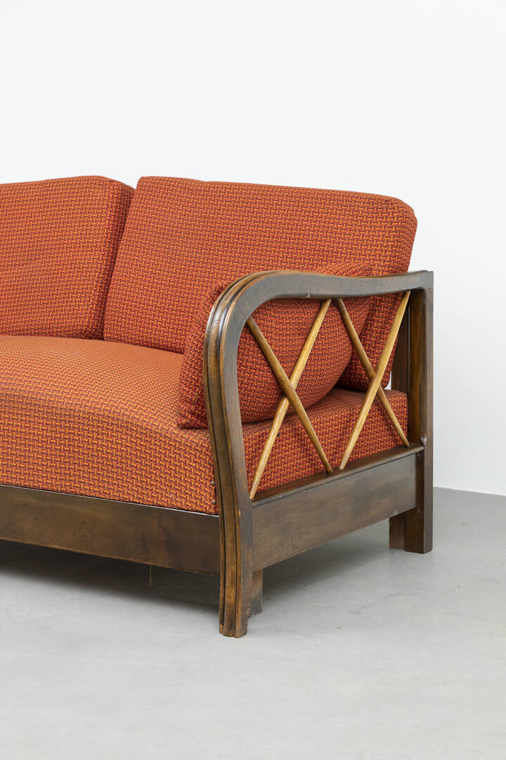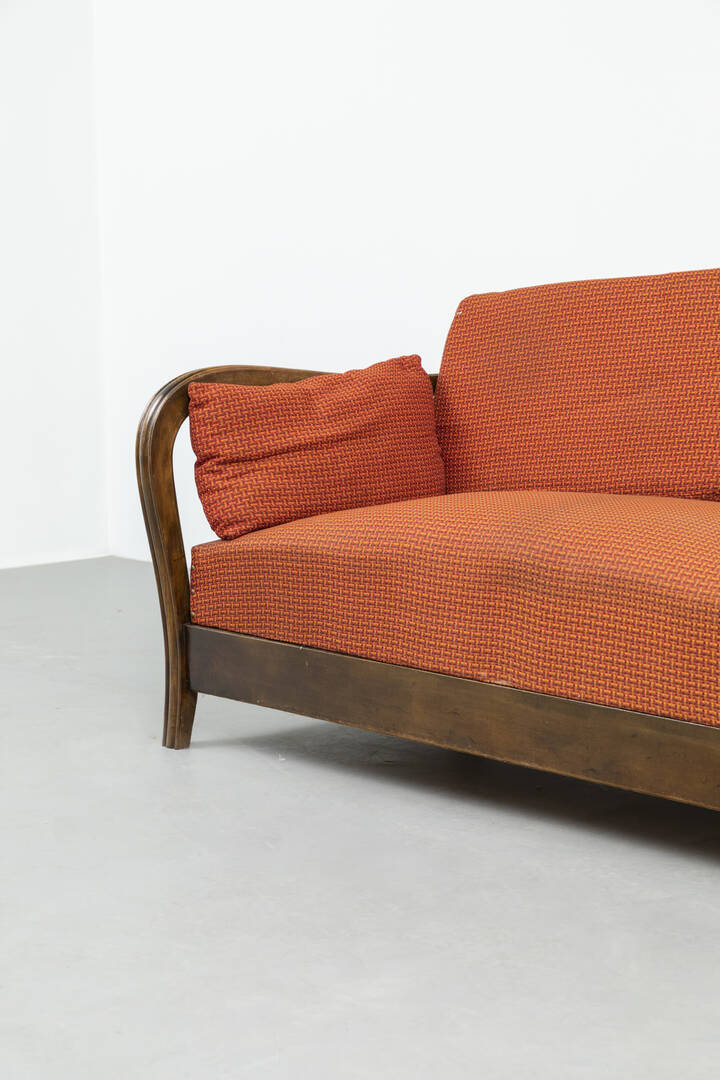 Divano con struttura in legno, cuscini imbottiti rivestiti in tessuto.