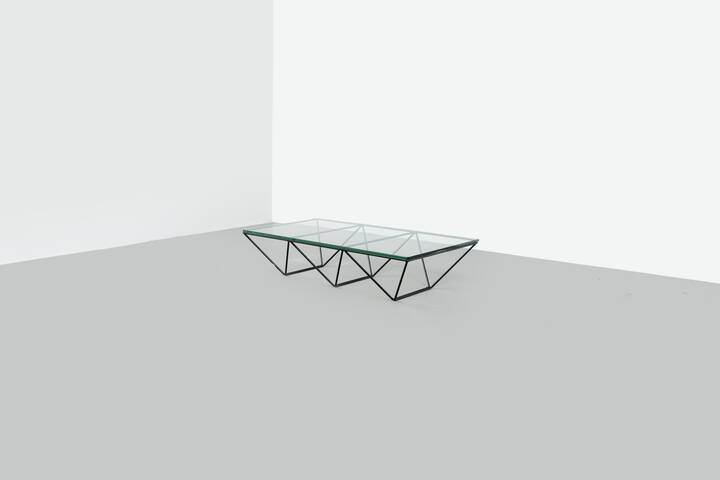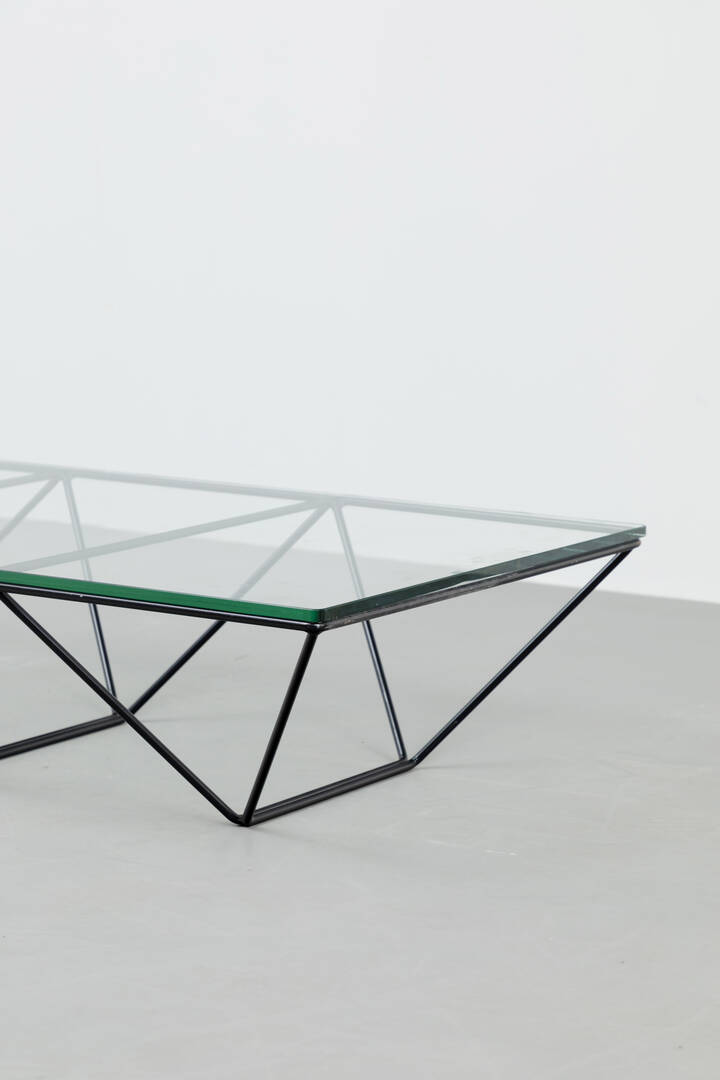 Tavolino in metallo verniciato e piano in cristallo.