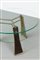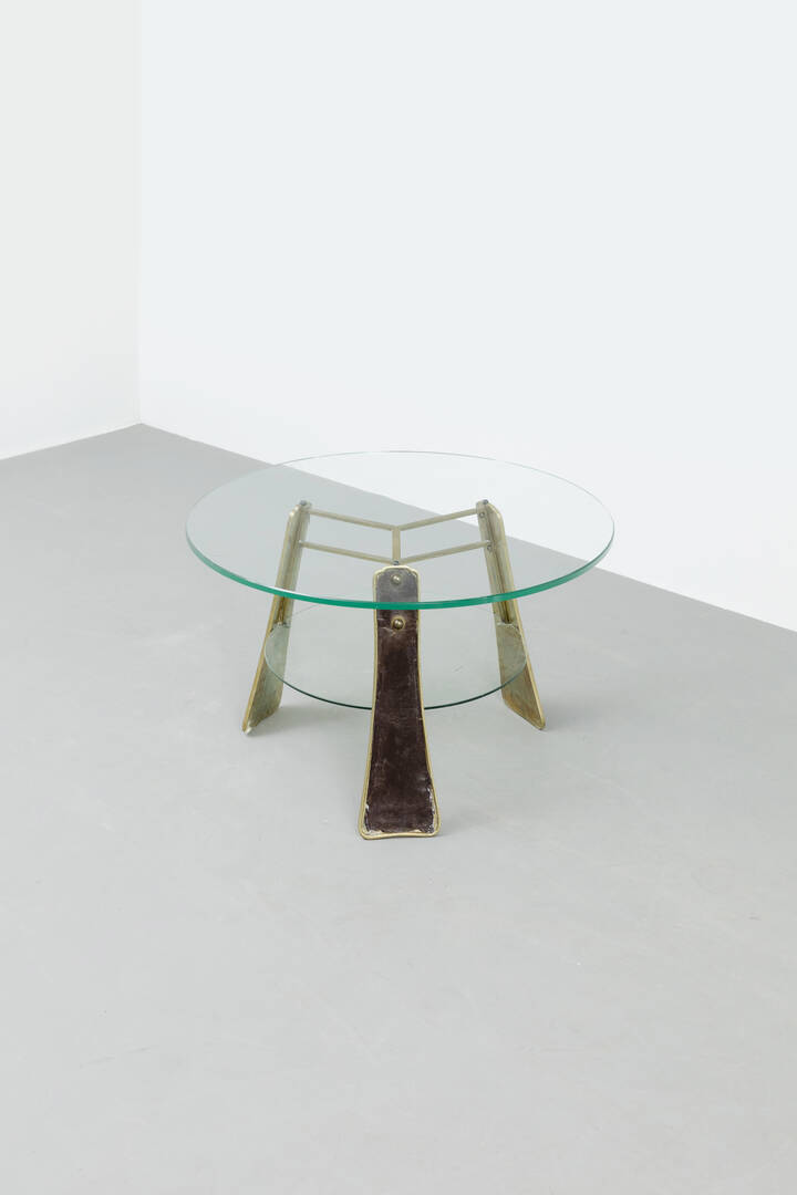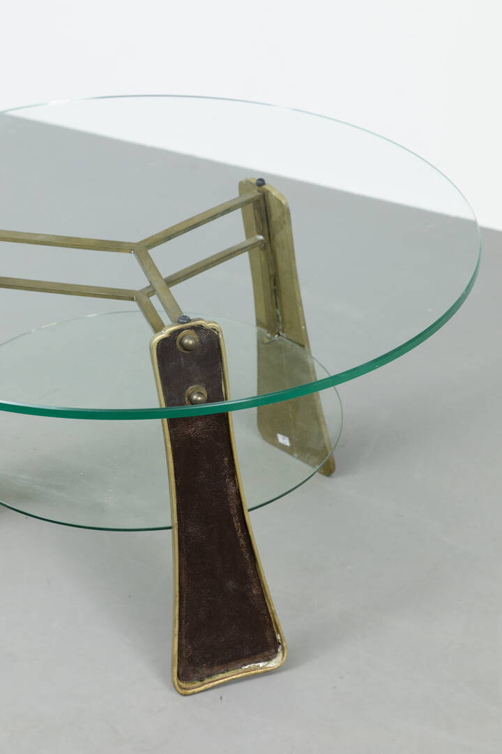 Tavolino in ottone, sostegni foderati in pelle e piani in vetro.