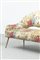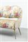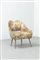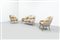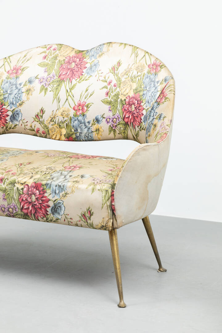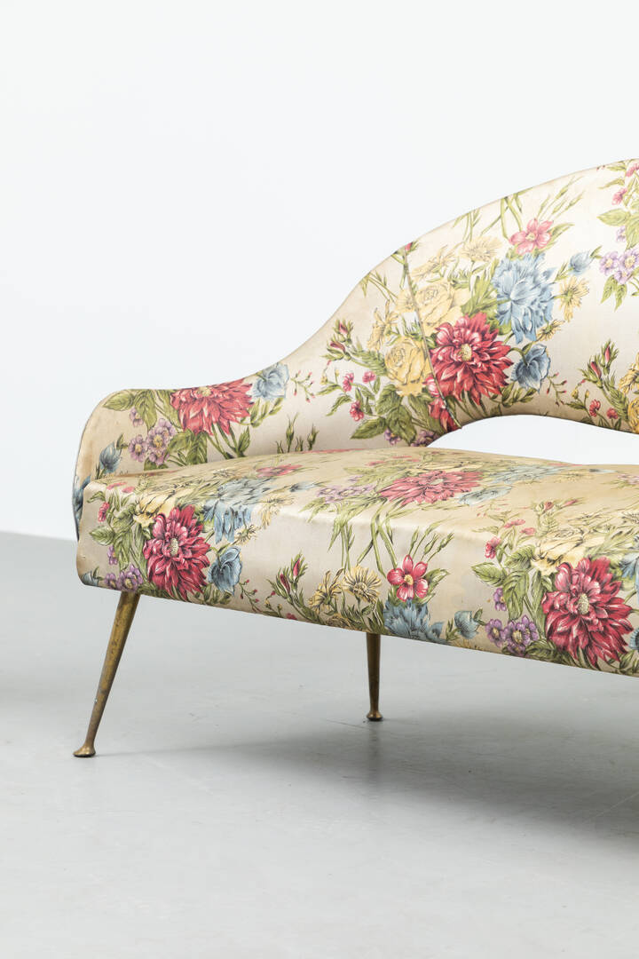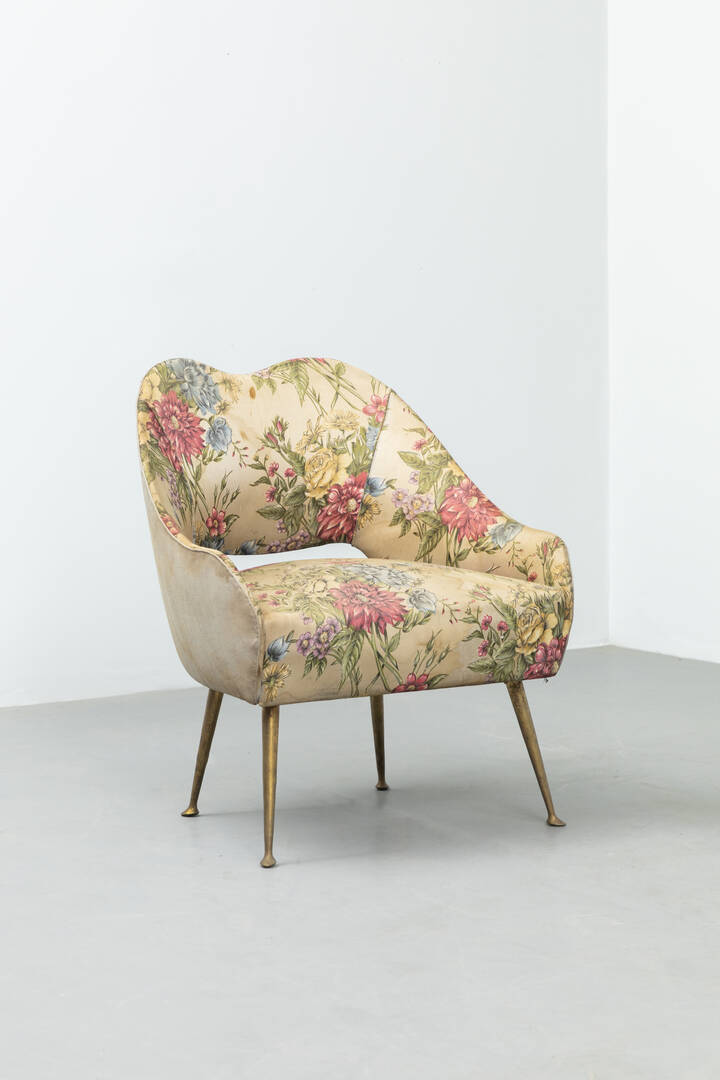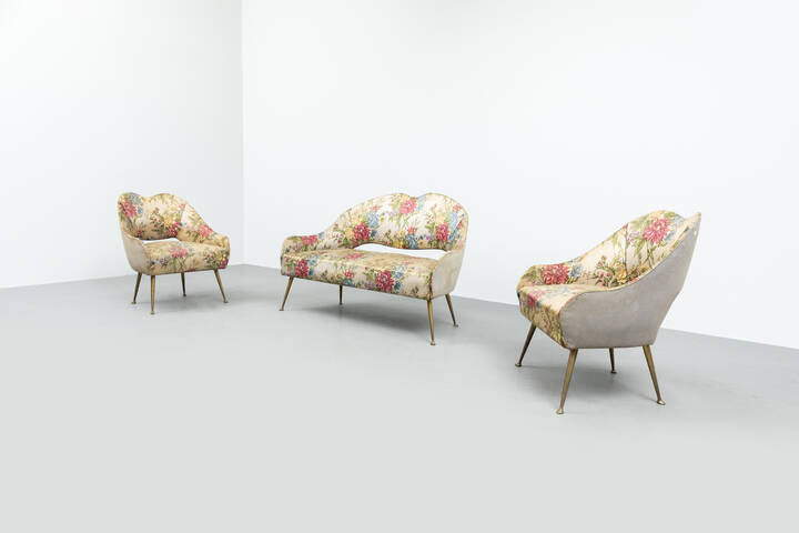Coppia di poltrone e divanetto con imbottitura rivestita in tessuto, sostegni in ottone.