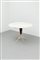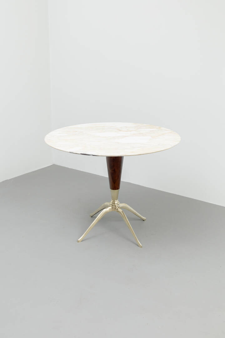 Tavolo con struttura in legno, sostegno in fusione di ottone, piano in marmo.