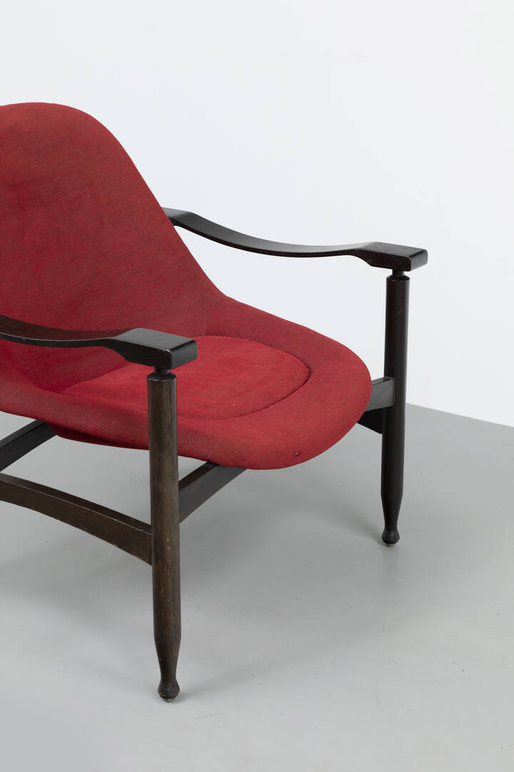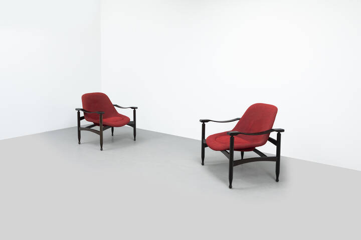 Coppia di poltrone con struttura in legno ebanizzato, imbottitura rivestita in tessuto.