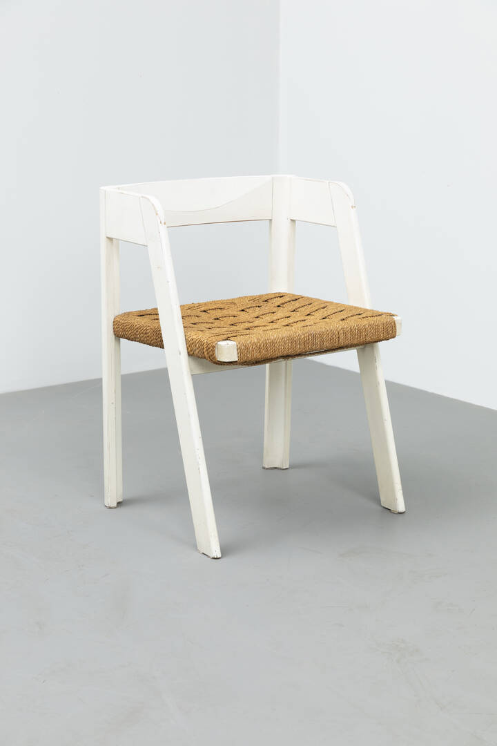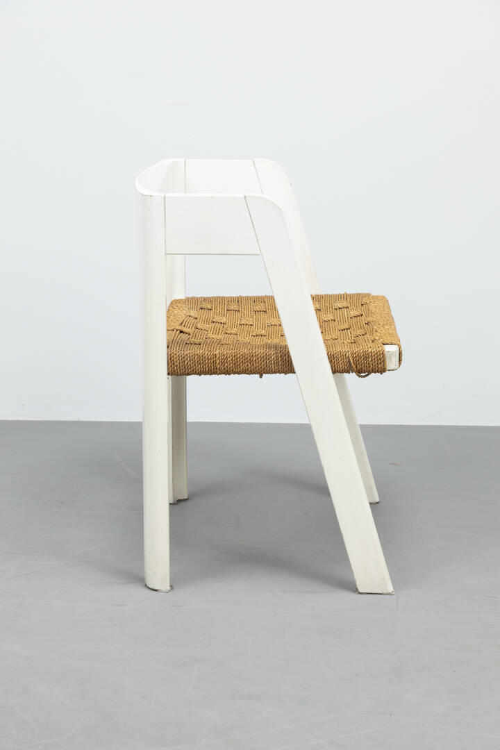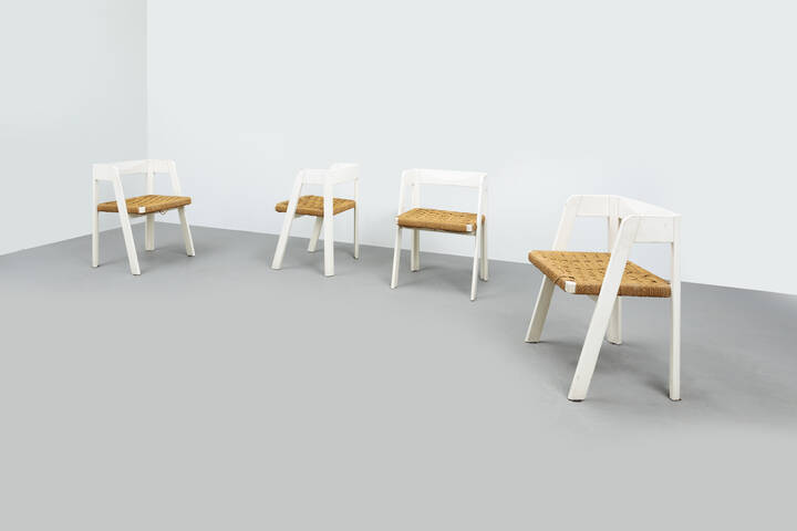 Quattro poltroncine in legno laccato, sedute in paglia intrecciata.