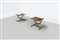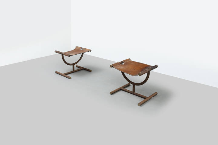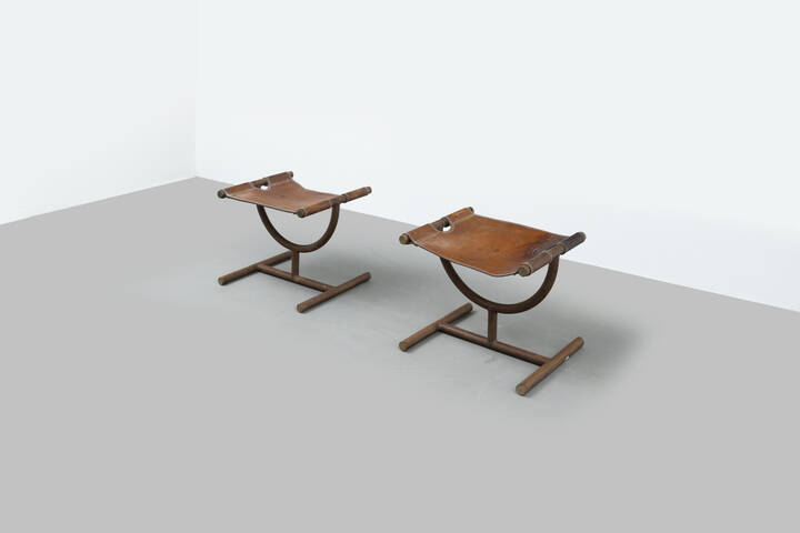 Coppia di sgabelli con struttura in ferro, sedute in pelle.