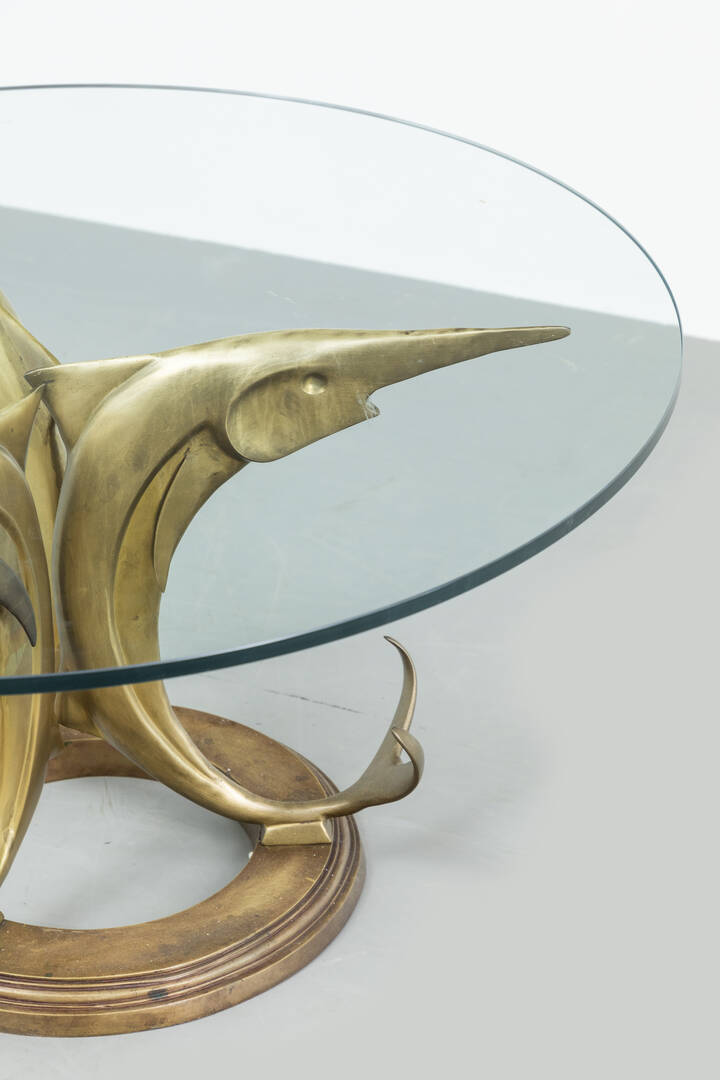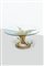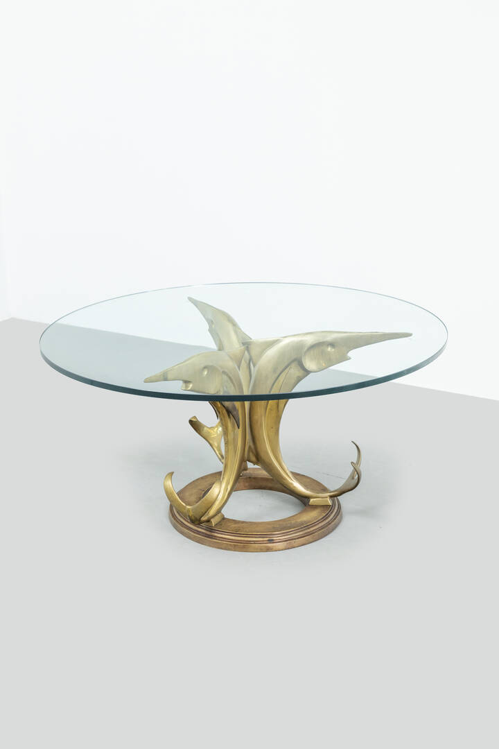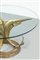 Tavolino con sostegno in ottone, piano in vetro molato.