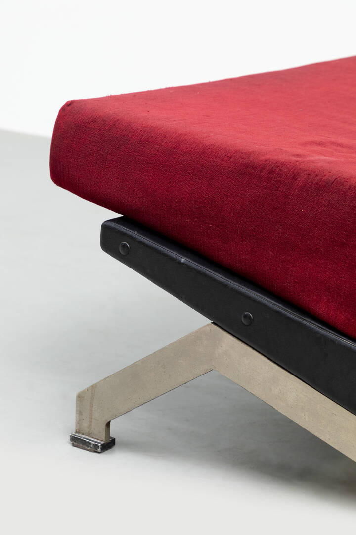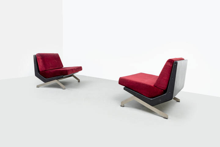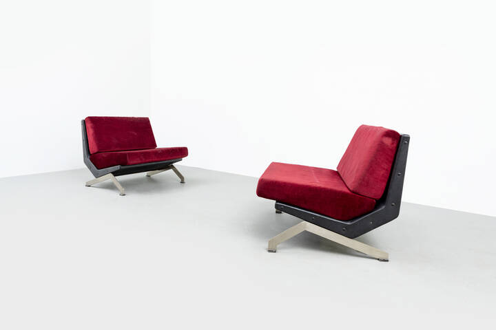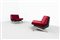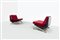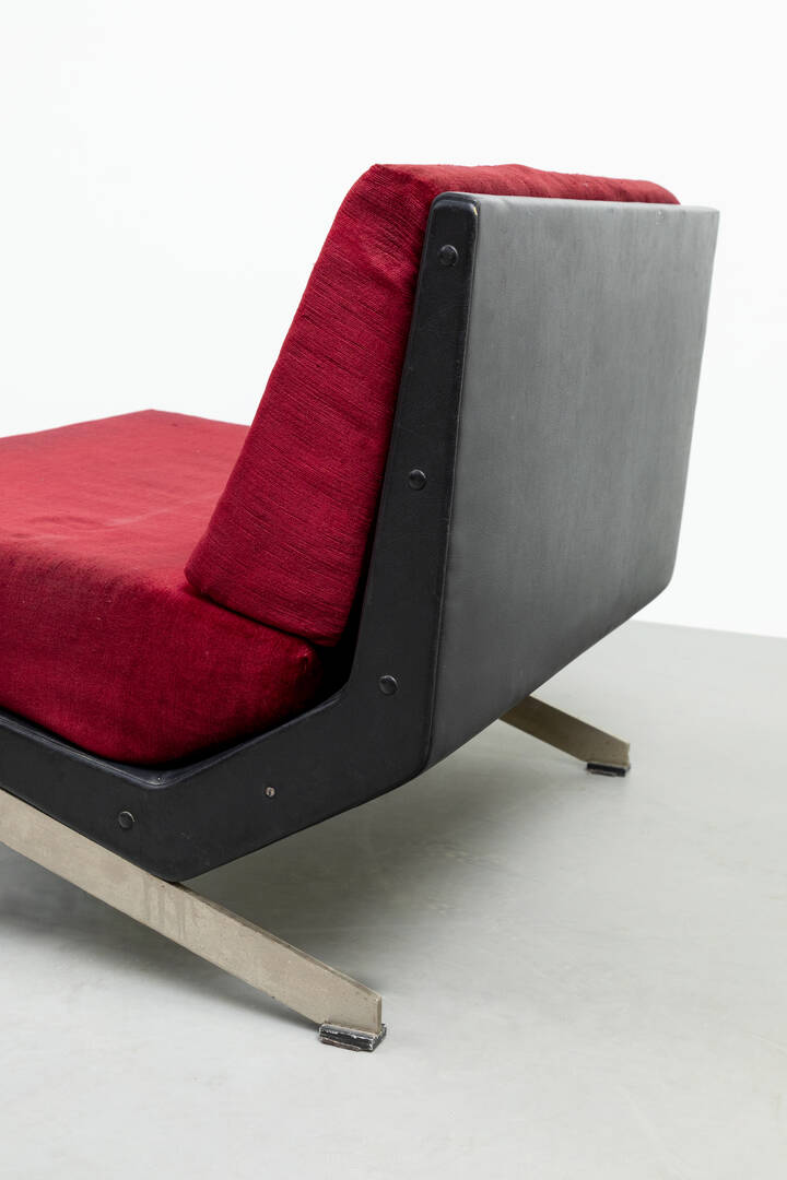 Coppia di poltrone con struttura in acciaio satinato e vinilpelle, imbottitura in tessuto.