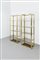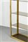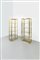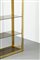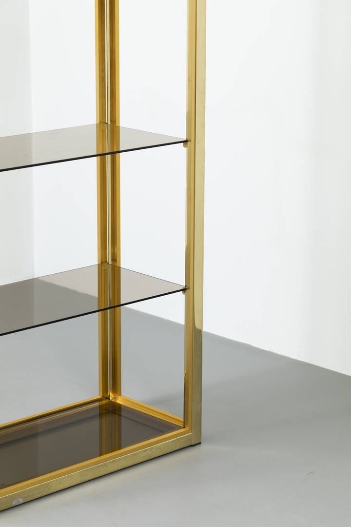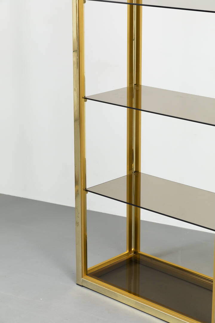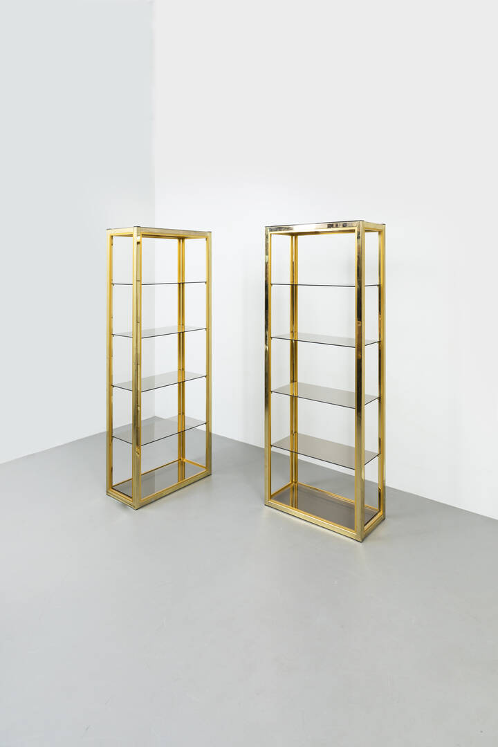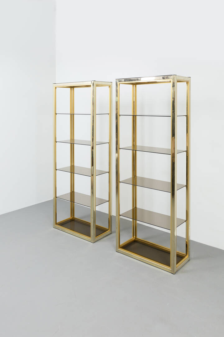Coppia di librerie con struttura in ottone lucido, piani in vetro fumeé.