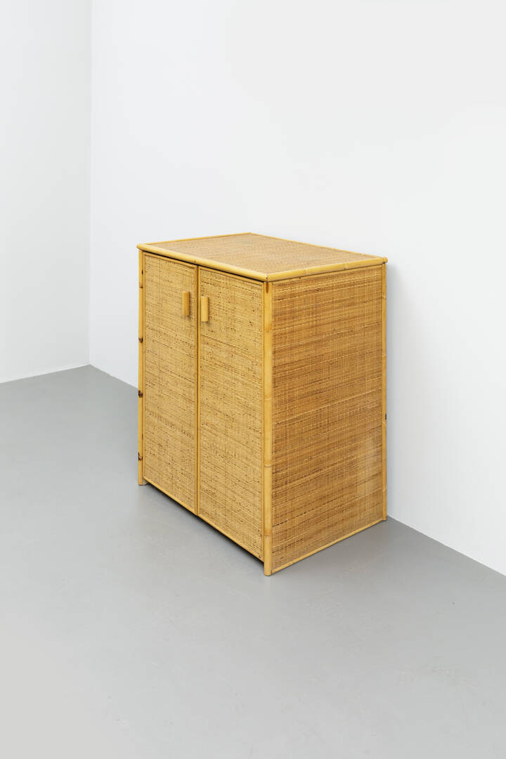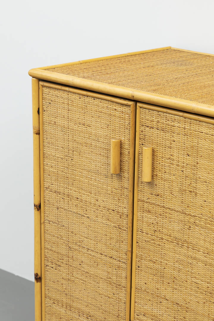 Mobile contenitore in giunco e bamboo a due sportelli.
