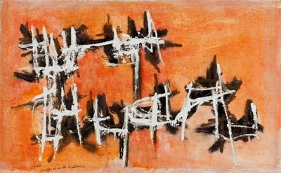 ACHILLE PERILLI Omaggio a un atto di intolleranza, 1957 tecnica mista su tela, cm. 47x77 firmato e titolato in basso a sinistra autentica dell'artista su foto con il n° 80/57 Omaggio a un atto di intolleranza, 1957 mixed media on canvas, cm. 47x77 signed and titled in the bottom left photo certificate from the artist with the n°80/57