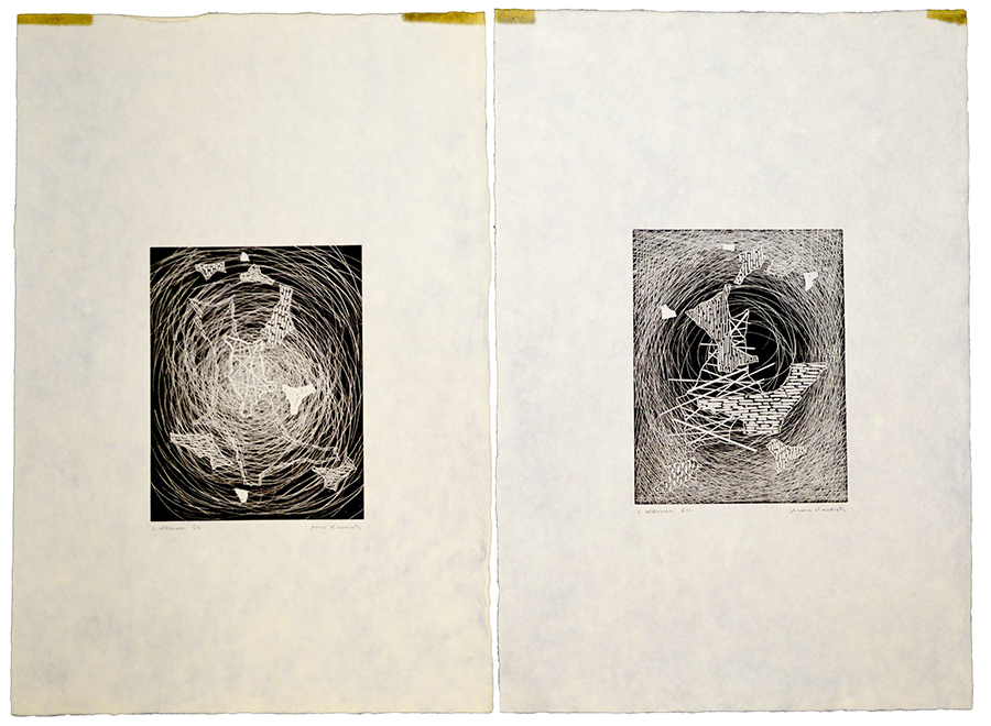 due acquaforte-acquatinta su carta, cm 20x15, foglio cm 51,5x33,5; es. p.d.a.