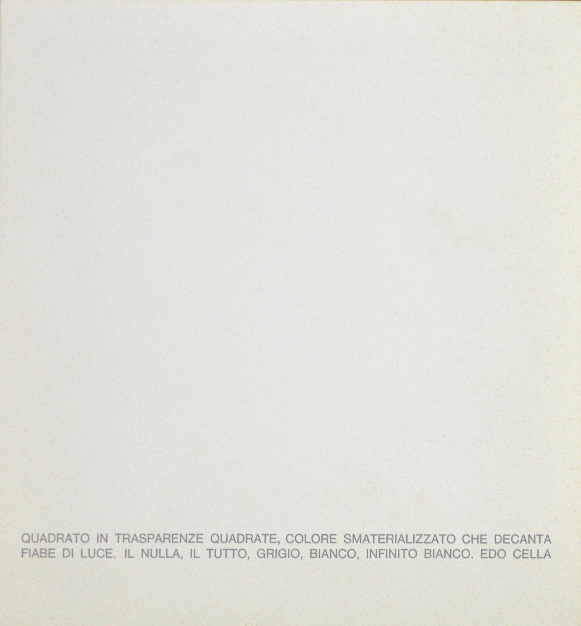 QUADRATO IN TRASPARENZE QUADRATE, COLORE SMATERIALIZZATO CHE DECANTA FIABE DI LUCE. IL NULLA, IL TUTTO, GRIGIO, BIANCO, INFINITO BIANCO. EDO CELLA