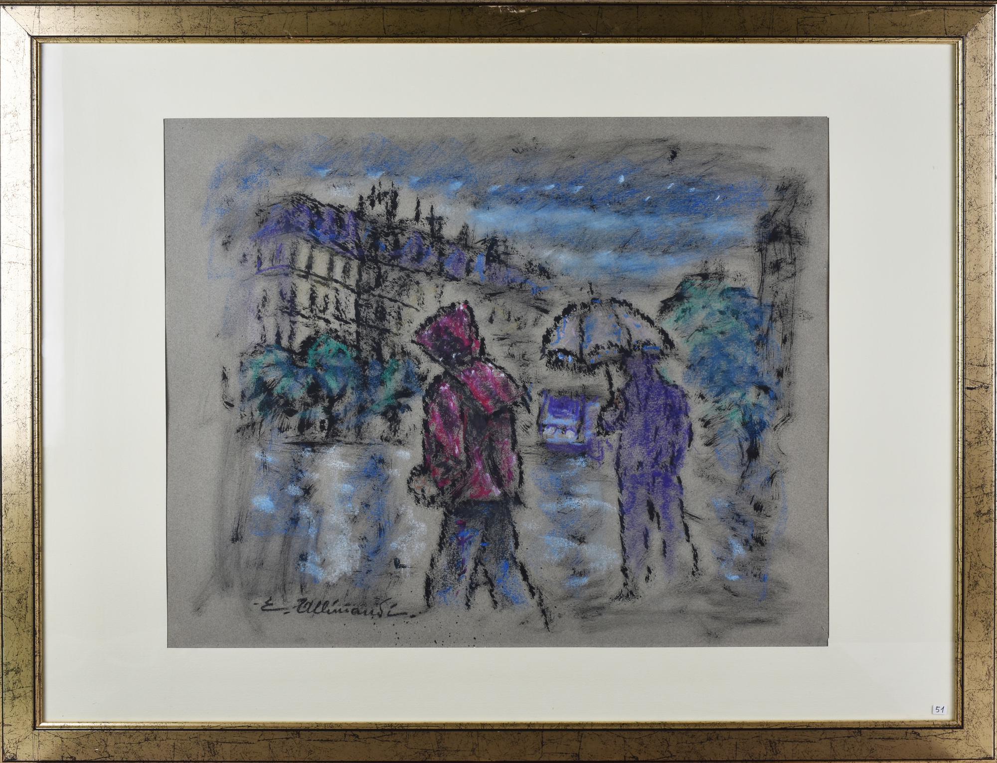 Enrico Allimandi GIORNATA PIOVOSA A PARIGI tecnica mista su carta, cm 42x50...