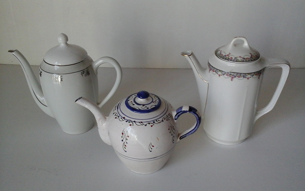 TRE TEIERE IN PORCELLANA E MAIOLICA MARCHI KPM E CECHOSLOVAKIA H.MAX. CM.20
