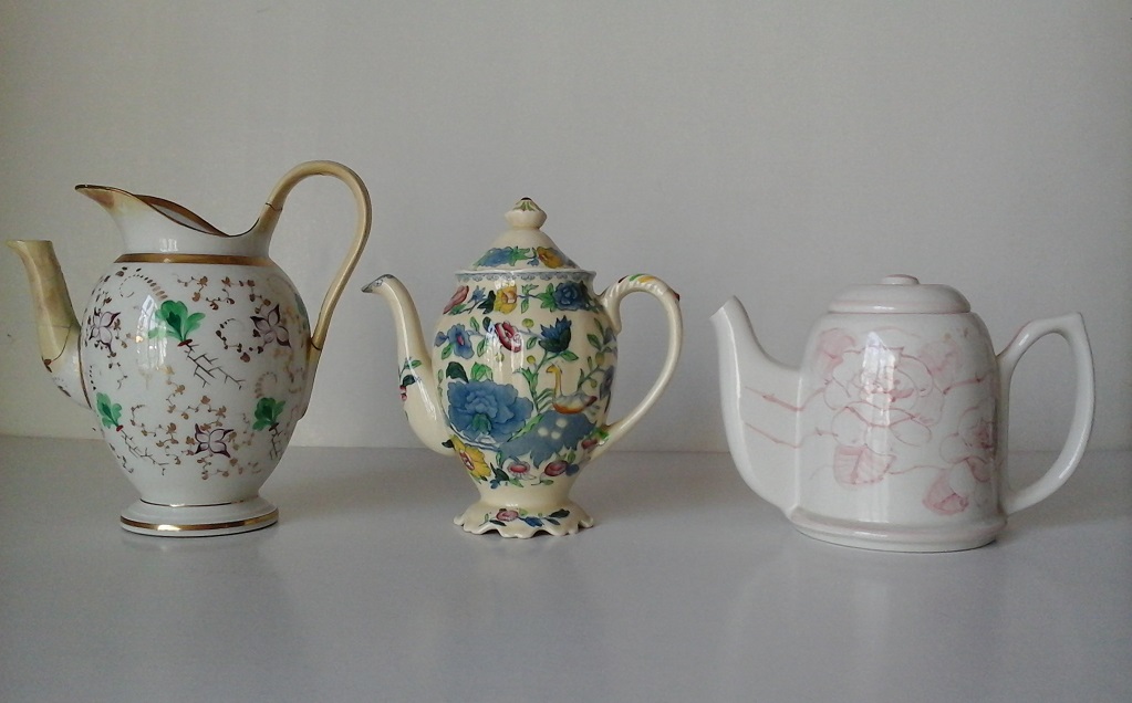 TRE TEIERE IN PORCELLANA E MAIOLICA UNA MARCHIO MASON'S E UNA CON FELATURE H.MAX. CM.21