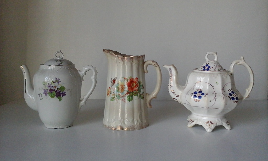 TRE TEIERE IN PORCELLANA E MAIOLICA H.MAX. CM.21