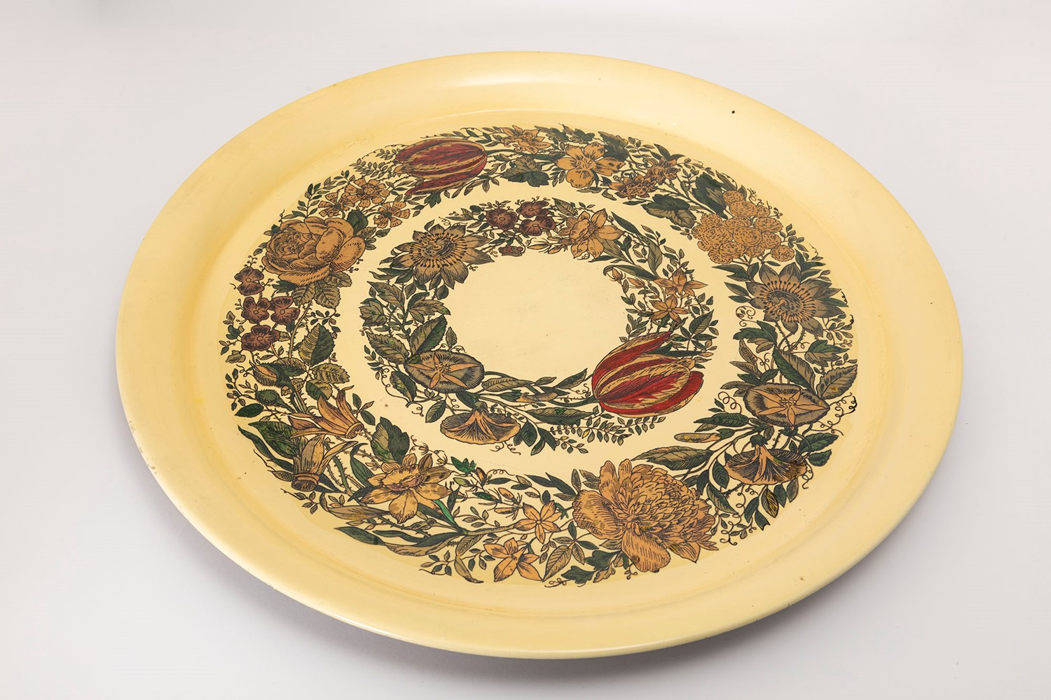 in metallo serigrafato a decoro floreale. Piccoli restauri.