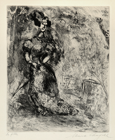 MARC CHAGALL La fille, 1953 acquaforte cm. 36x30 firmato in basso a destra titolato in basso a sinistra firmato in basso a sinistra sulla lastra autentica galleria Rotta su fotografia provenienza: galleria Rotta-Genova La fille, 1953 etching cm. 36x30 signed in the bottom right titled in the bottom left signed on plate in the bottom left photo certificate from Rotta gallery-Genova provenance:Rotta gallery-Genova