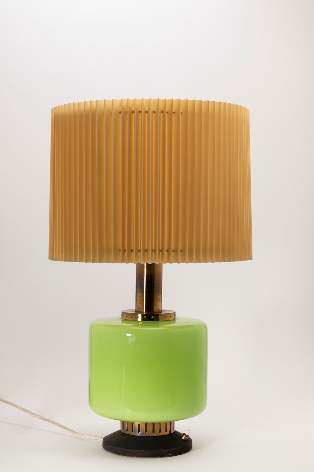 in alluminio verniciato, ottone nichelato, vetro colorato verde e carta.