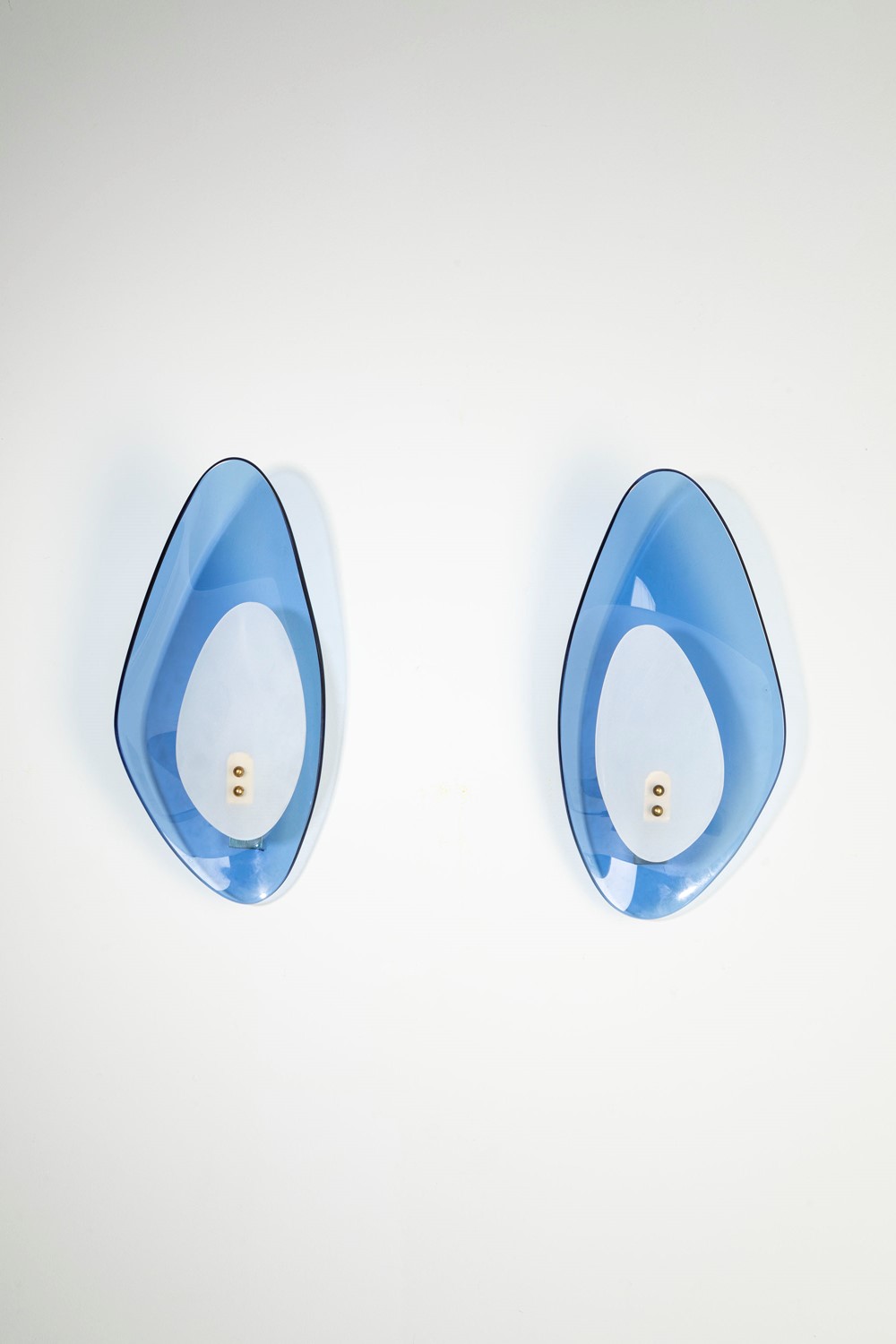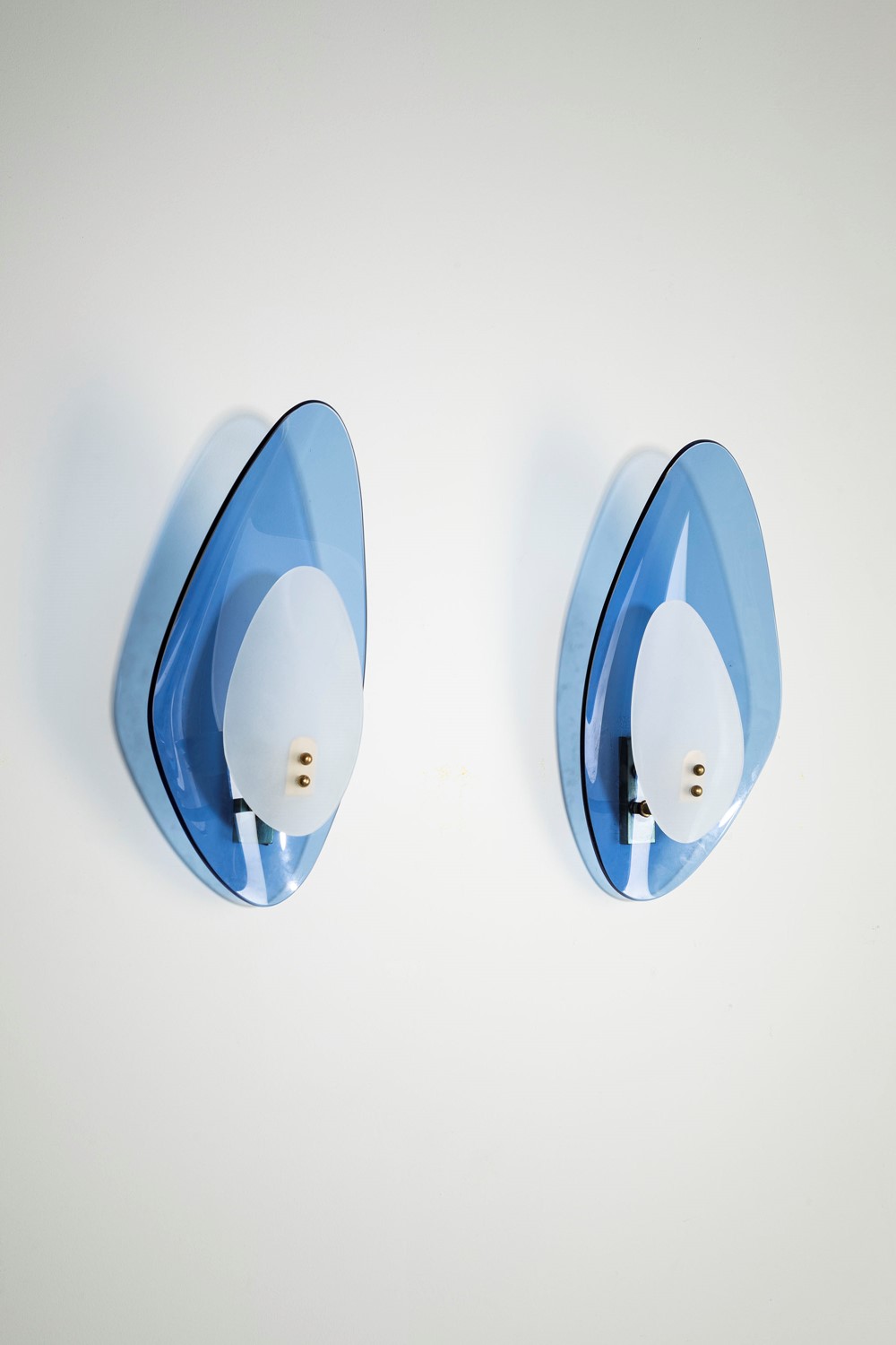 in vetro curvato blu e opalino e elementi in metallo.