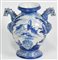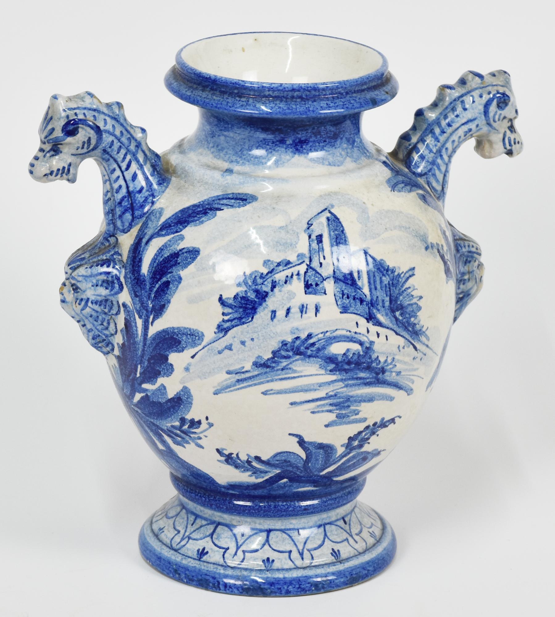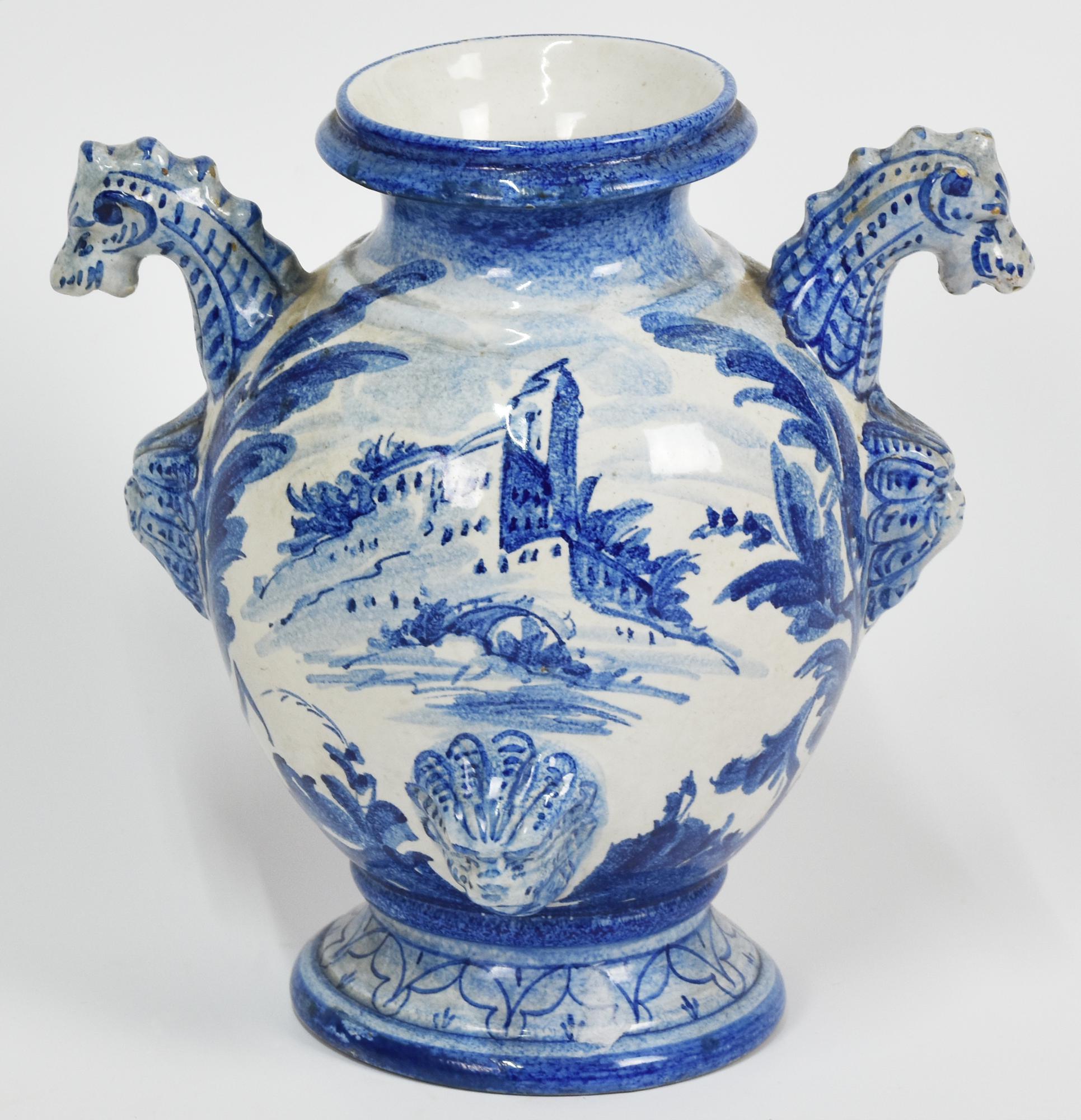 ANFORA IN MAIOLICA con decorazioni blu cobalto e impreziosita da mascheroni e...
