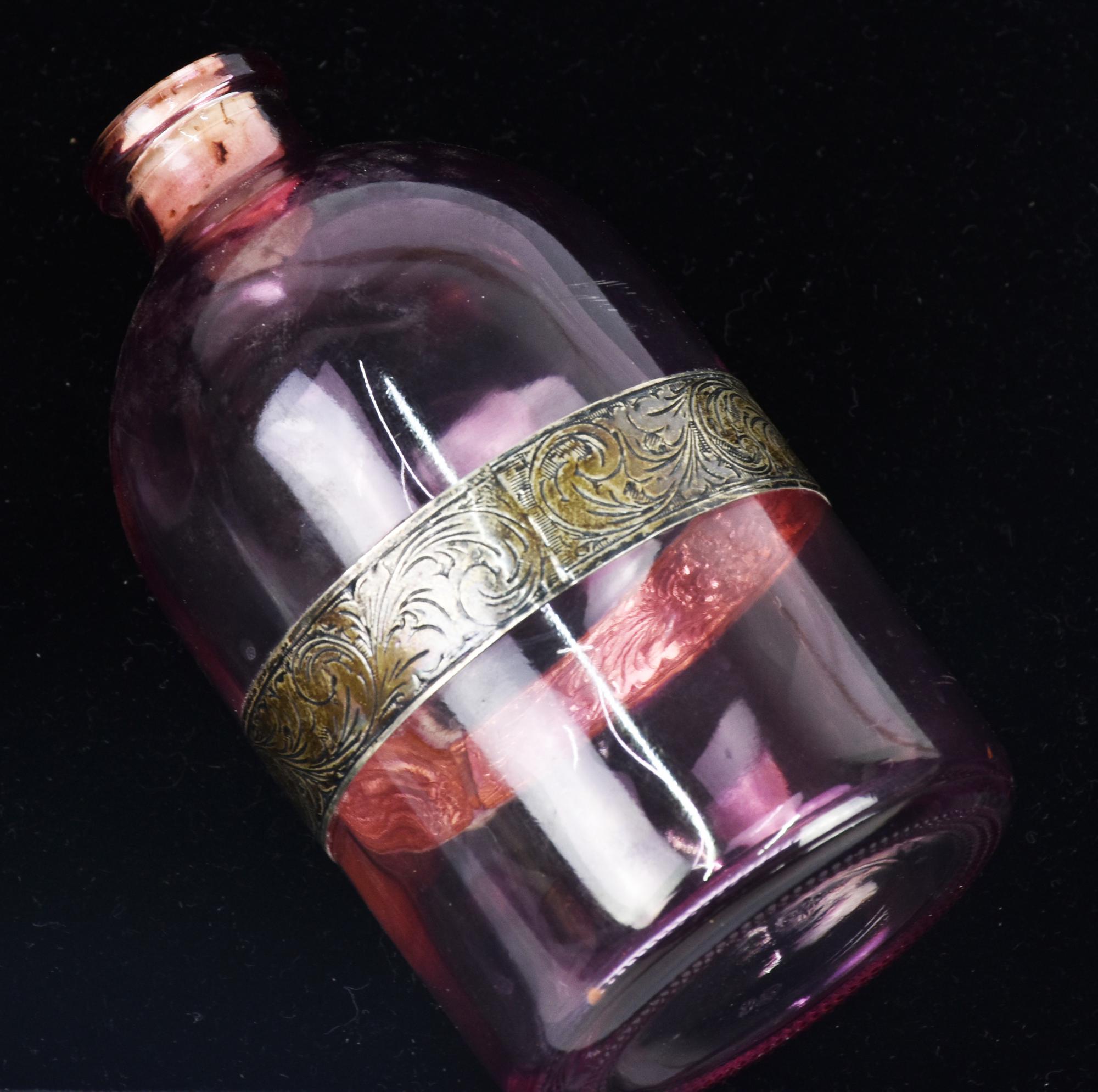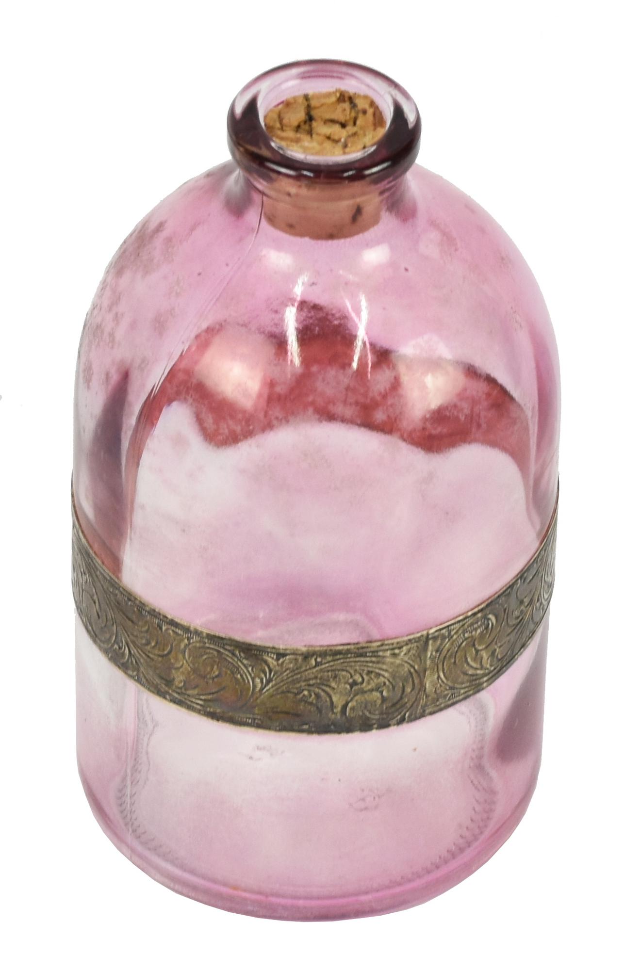 BOTTIGLIETTA PORTAPROFUMO in vetro rosato decorato con fascia in argento...