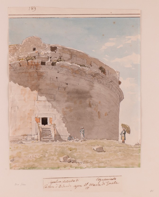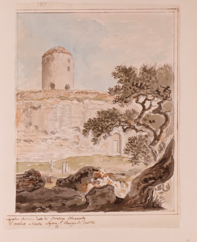 In basso antica iscrizione forse autografa: "SEPOLCRO ANTICO DETTO DI ATRETINO CHIAMATO / IL MOLINO A VENTO SOPRA IL BORGO DI GAETA / 13". In alto iscrizione a penna: "187".