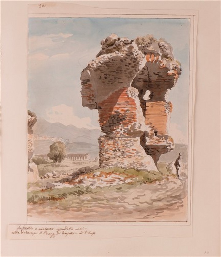 In basso antica iscrizione probabilmente autografa: "ANFITEATRO A MINTURNO AQUEDOTTO ANTICO / NELLA DISTANZA IL PAESE DI FRAIETTO ED IL TUFO / 20". In alto iscrizione a penna: "201".