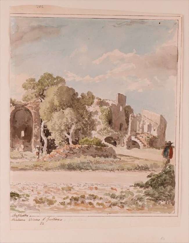 In basso antica iscrizione probabilmente autografa: "ANFITEATRO / A MINTURNO VICINO IL GARILIANO / 21". In alto iscrizione a penna: "202".