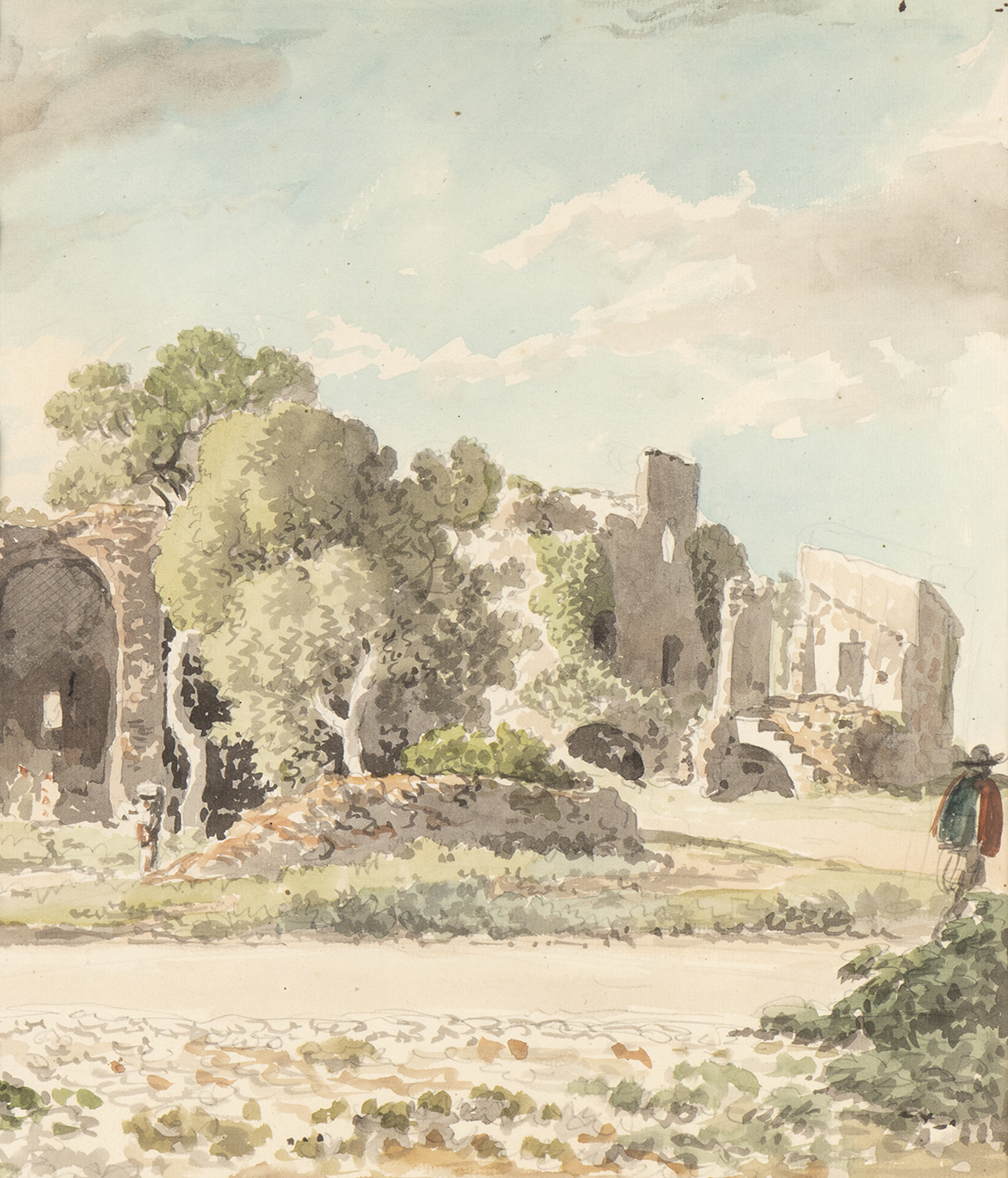 BIBLIOGRAFIA DI RIFERIMENTO: P.A. De Rosa - B. Jatta, La Via Appia nei disegni di Carlo Labruzzi alla Biblioteca Apostolica Vaticana, Città del Vaticano, Biblioteca Apostolica Vaticana, 2013, TAV. 195, pp. 430-431 (di questa veduta sono pubblicate due versioni in seppia conservate presso la Biblioteca Apostolica Vaticana e l'Accademia di San Luca, più una copia policroma presso la Biblioteca Apostolica Vaticana).