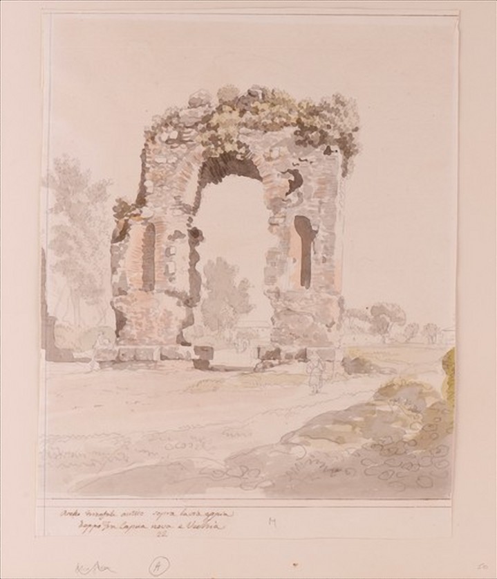 Il disegno si presenta ridotto lungo il margine sinistro e destro. In basso antica iscrizione probabilmente autografa: "ARCO FRONTALE ANTICO SOPRA LA VIA APPIA / FRA CAPUA NOVA E VECHIA".