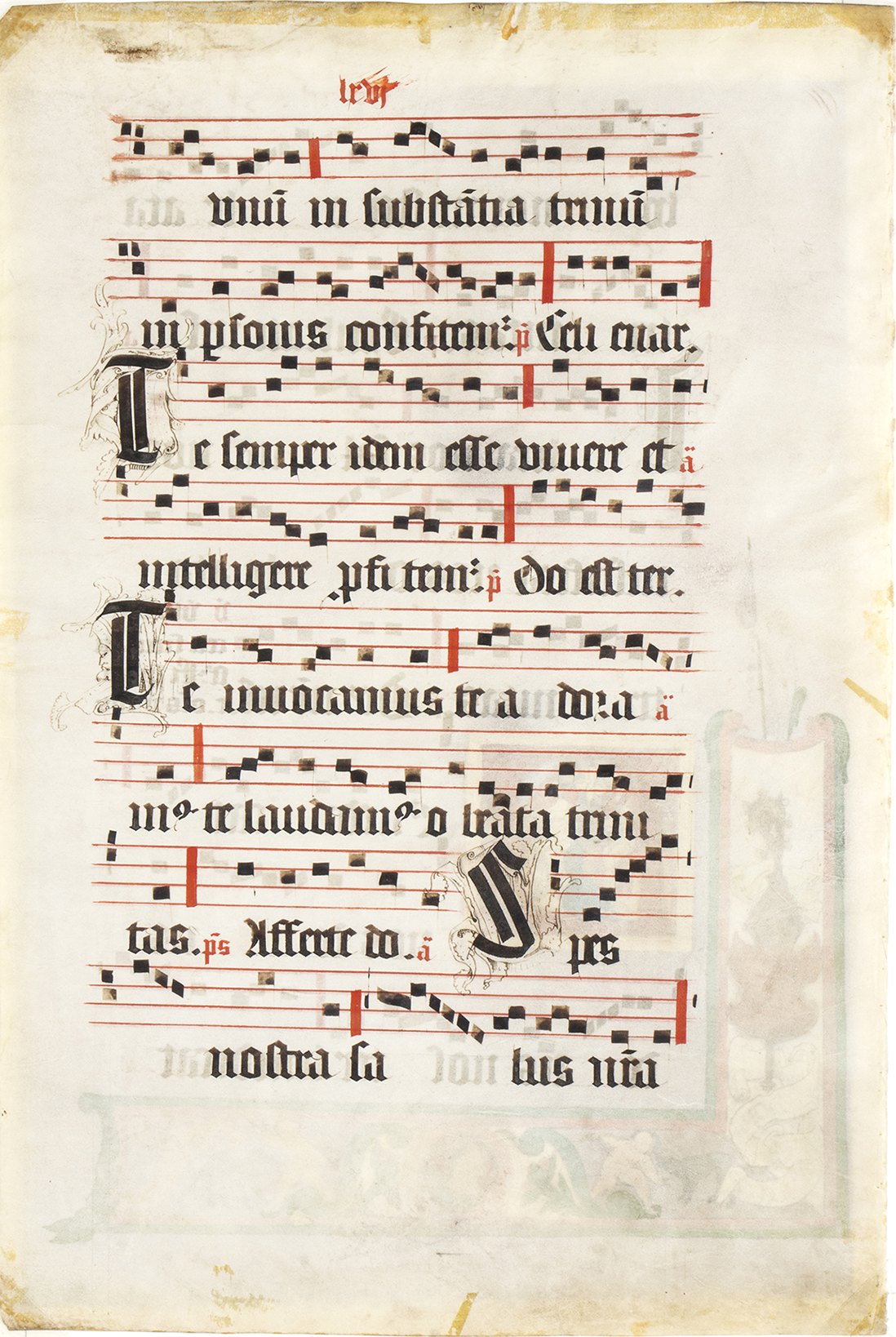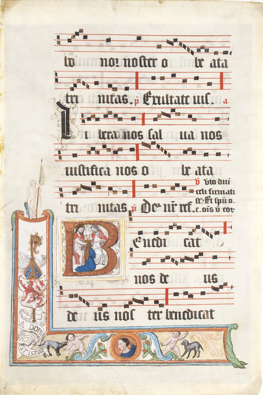 Antifonario con lettera "B" miniata. All'interno Trinità e Vergine incoronata e bordura con motivi araldici, putti, due cani e un medaglione con figura di profilo.