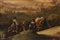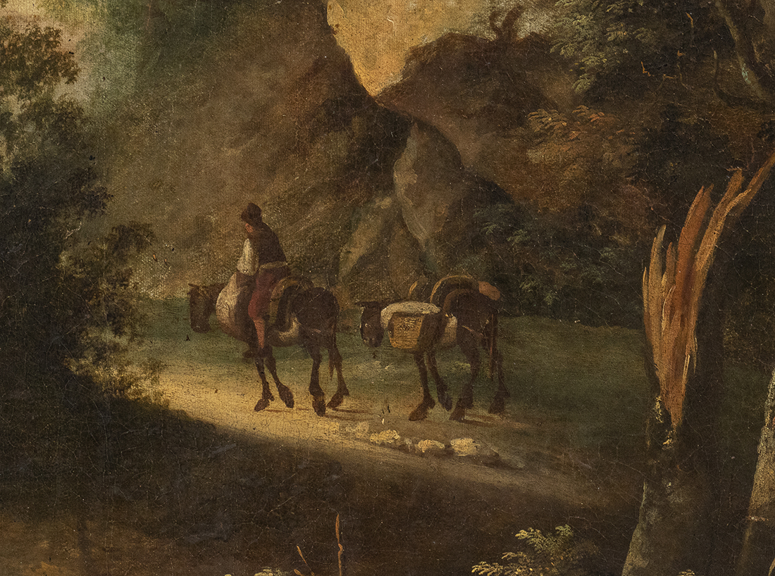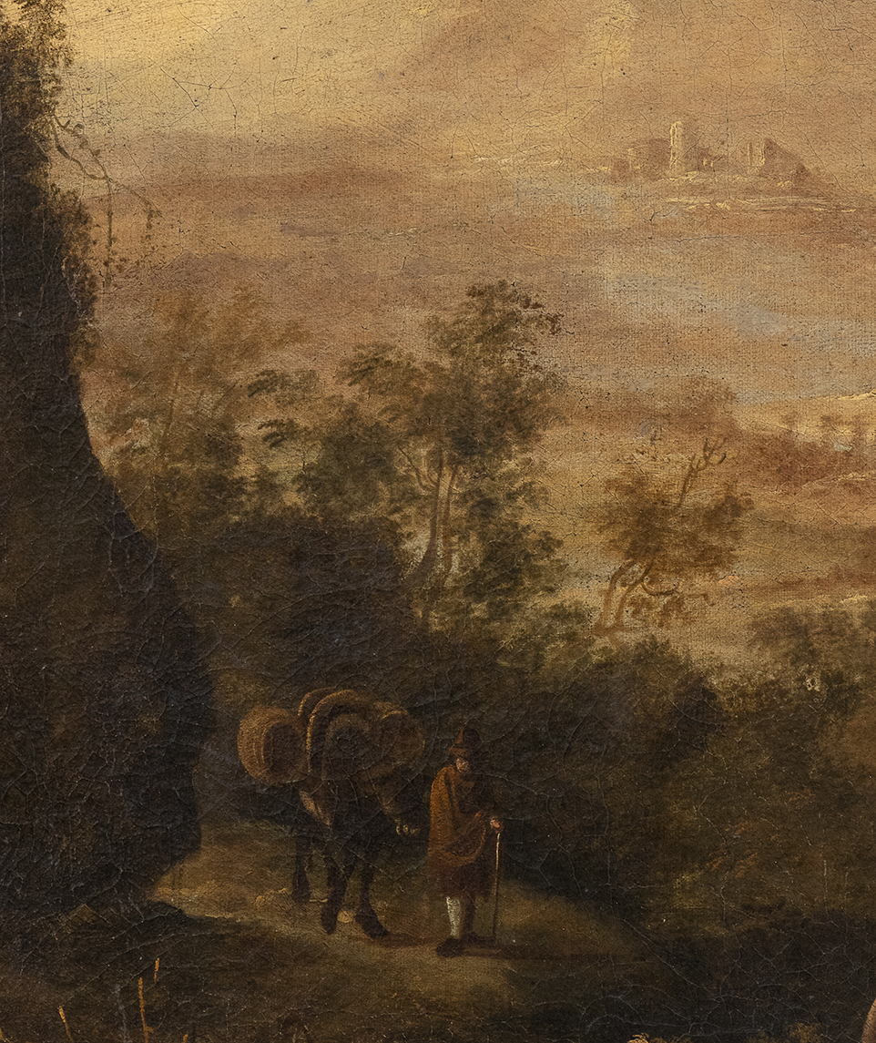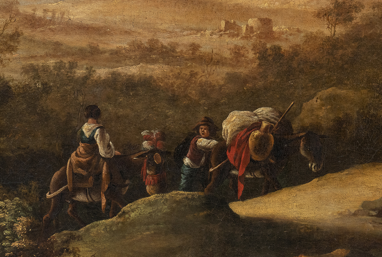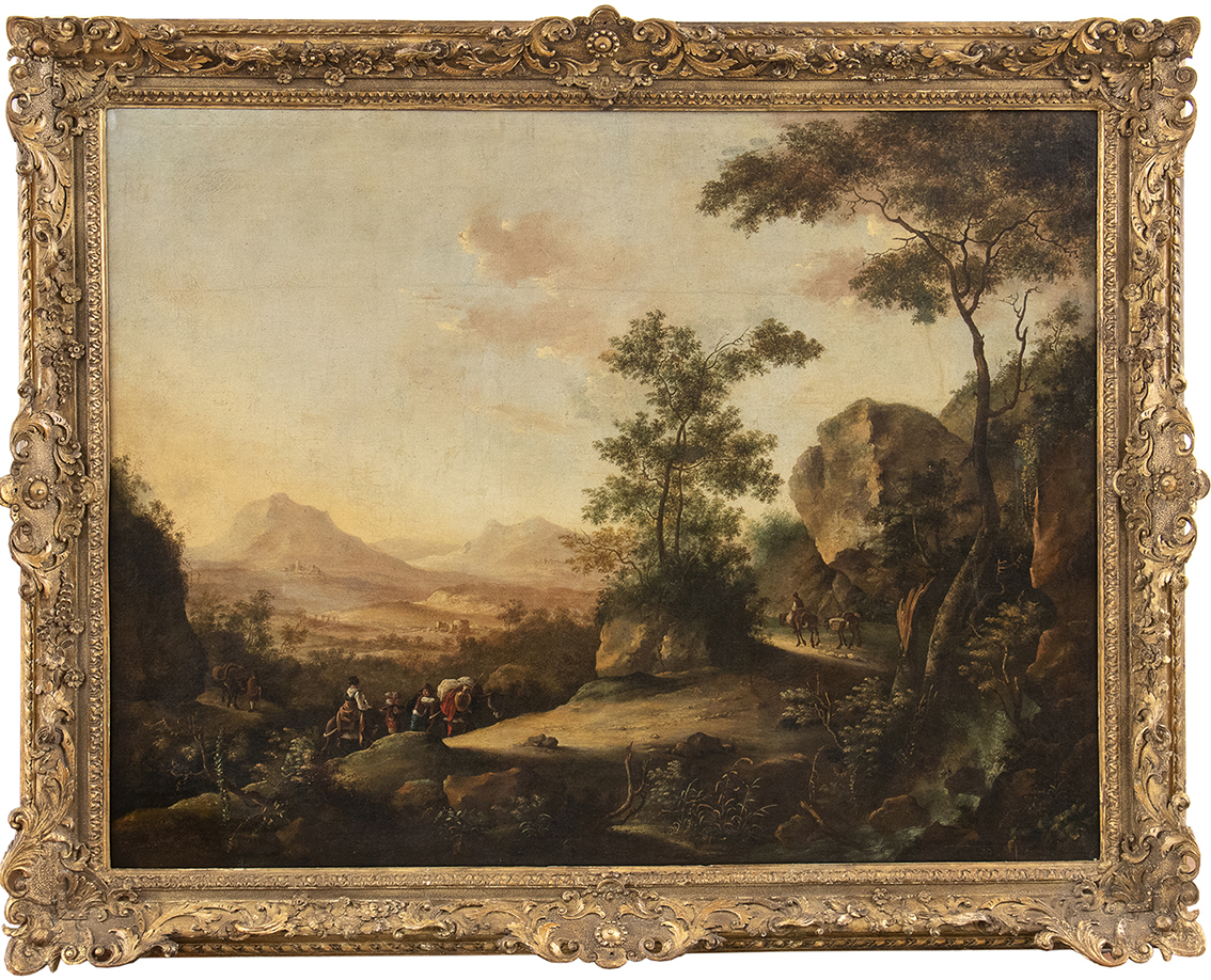 Jan Frans Van Bloemen e suo fratello Pieter giunsero a Roma verso il 1687, dopo un primo soggiorno italiano a Torino. Di lì sino al rientro ad Anversa di Pieter, tra la fine del 1692 e il principio del 1693, i due fratelli collaborarono spesso, pur svolgendo anche una prolifica attività autonoma, dividendosi i compiti fra le figure e gli animali di responsabilità di Pieter e il paesaggio affidato a Jan Frans (che in breve sarebbe diventato il pittore di paesaggio per eccellenza sulla scena artistica romana). Questo superbo paesaggio con carovana di viandanti, eseguito su tela “da imperatore”, sebbene rechi la firma del solo Jan sembra corrispondere alle caratteristiche dei dipinti riconducibili alla collaborazione dei due fratelli. In particolare vale la pena di segnalare qui le affinità con le sei grandi tele, di misure analoghe alla nostra, che si conservano presso il Palazzo di Propaganda Fide in Roma, in modo speciale quella al n. 5 del catalogo ragionato di Busiri Vici (p. 64, fig. 57), che presenta evidenti analogie col nostro nella composizione e nel paesaggio; ma anche con uno dei due Paesaggi laziali senza figure della Galleria Doria Pamphili (Busiri Vici, p. 65, fig. 58 e cat. 8). Per le figure appare puntuale il riscontro con i viandanti nella Campagna laziale all’imbrunire, pure nella Galleria Doria Pamphili (Busiri Vici, p. 68, fig. 63 e cat. 14). Al di là della presenza di Pieter, pur sempre ipotetica, all’interno di questo luminoso paesaggio di respiro veramente monumentale, resta comunque appropriata la sua rara collocazione nella produzione di Van Bloemen dell’ultimo decennio del XVII secolo, ancora agli inizi della sua straordinaria carriera romana.