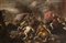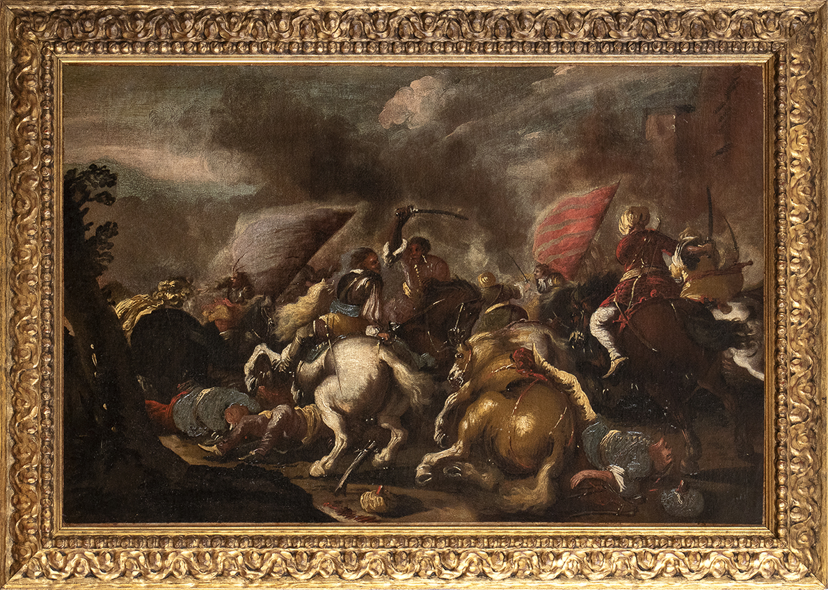 Di liberissimo andamento pittorico, questa grande zuffa di cavallerie presenta i caratteri tipici della produzione del veronese Matteo Stom, che assieme a Calza, Brescianino e Antonio Maria Marini fu tra i migliori e più originali seguaci in area padana del Borgognone. Ritroviamo qui il concitato dinamismo dell’azione, l’acceso cromatismo, il ductus irruento e le figurette appena sbozzate che costituiscono la marca stilistica più peculiare delle opere di Stom (Battaglia del Museo di Ca’ Rezzonico a Venezia, o quelle della Galleria d’Arte Zanni di Bergamo, o già in Coll. Sabatello a Roma).