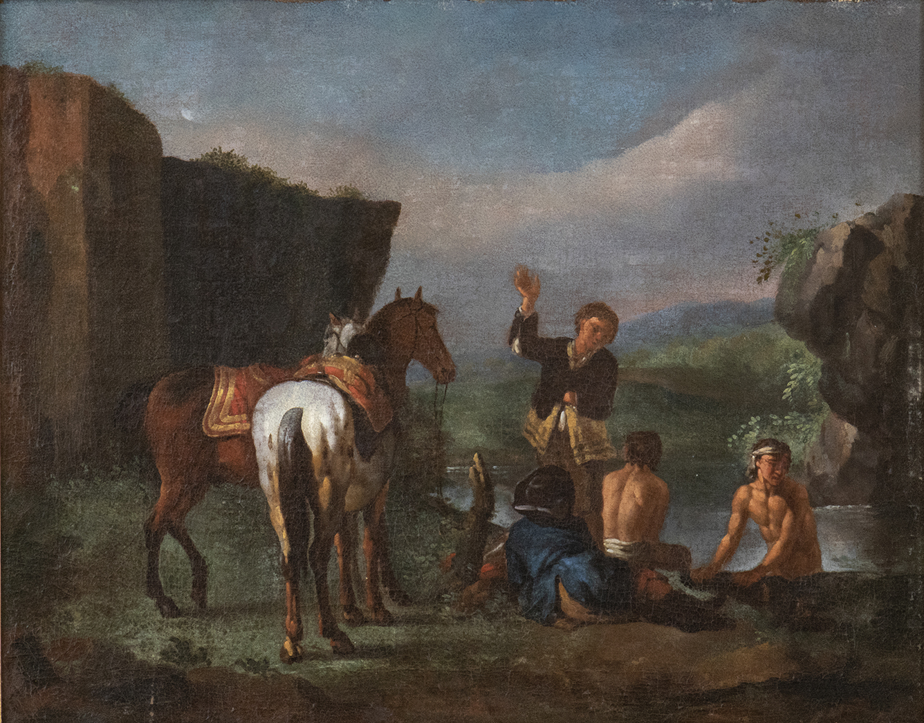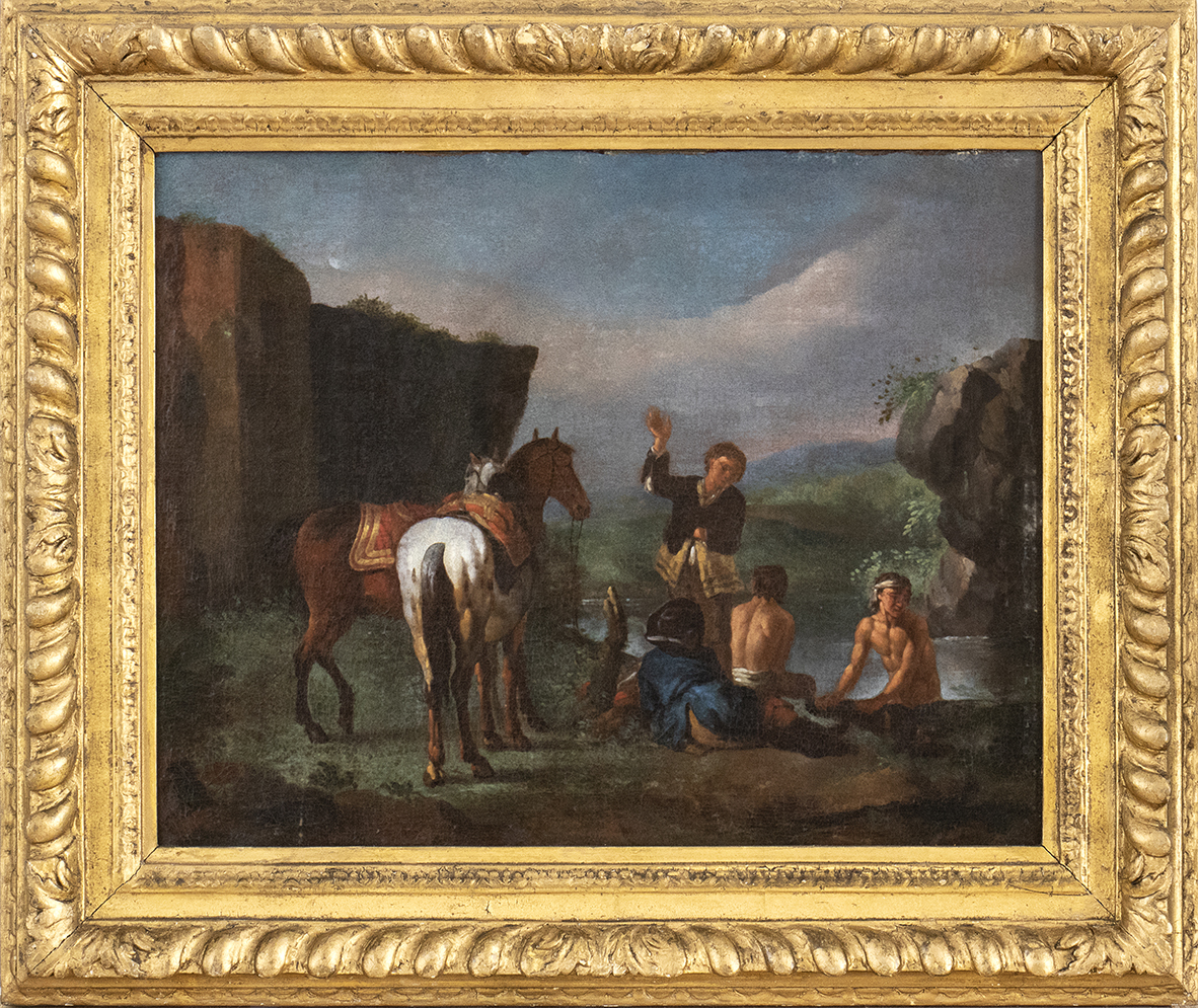Il tipico modello compositivo di matrice fiamminga raffigurante la sosta di cavalieri, si mostra nel dipinto qui proposto attraverso delle soluzioni formali che ne orientano l’attribuzione al pittore olandese Philips Wouwerman. Il taglio della composizione con le ampie quinte sui lati e la posizione dei cavalli rispetto alla figura stante al centro della composizione, richiamano la medesima costruzione scenica del Cavaliere e mendicanti del Landesmuseum für Kunst und Kulturgeschichte di Oldenburg in Germania. Alla medesima opera può essere confrontato anche il lotto successivo, di cui si propone la medesima attribuzione.