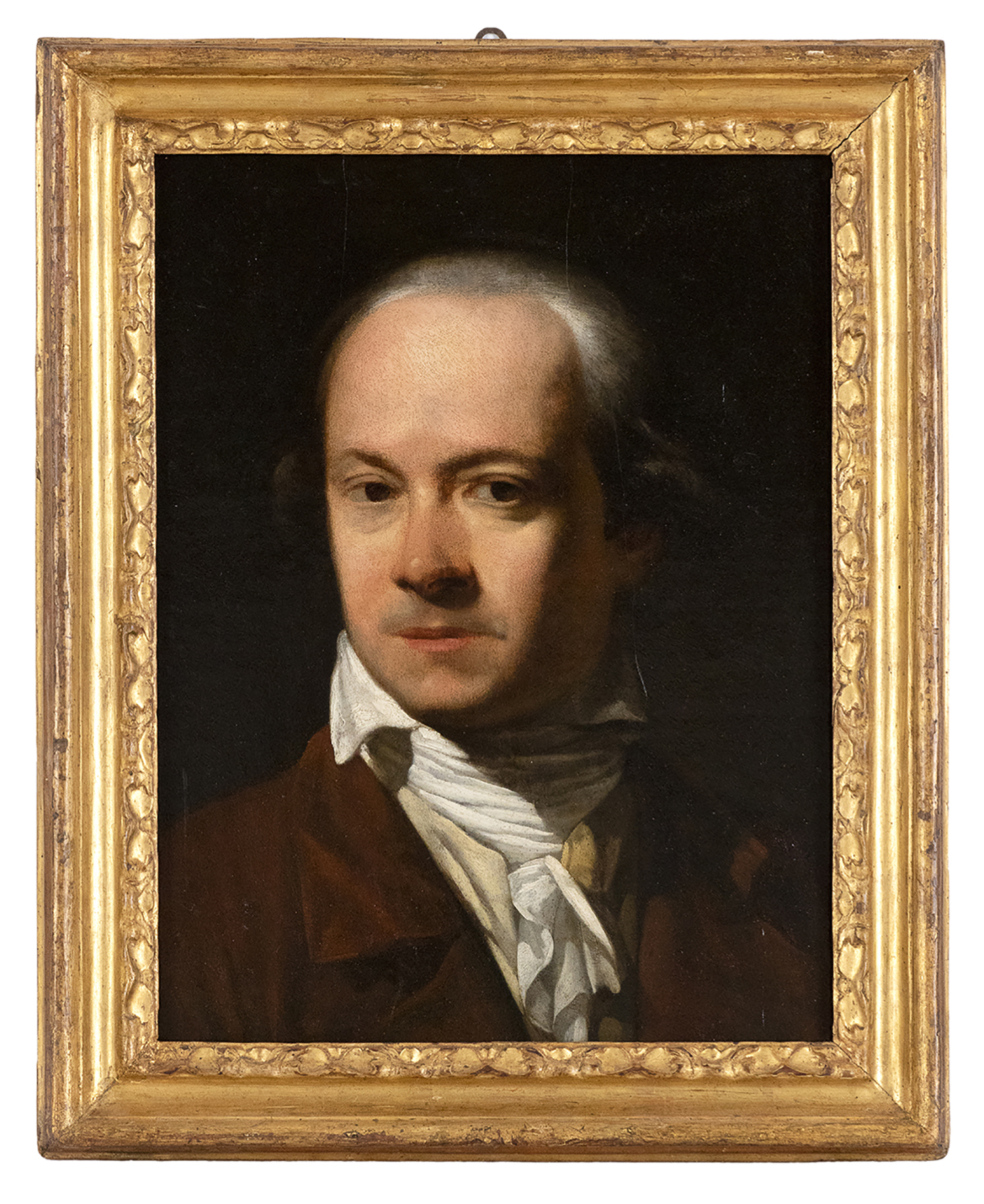 La bella tavola qui proposta, in eccellente stato di conservazione, rivela un’attenta e ponderata costruzione dell’immagine, ottenuta tramite ben calibrati accorgimenti formali. Il taglio compositivo mostra il ritrattato muovere il volto verso sinistra, in corrispondenza con l’impercettibile abbassamento della spalla, mantenendo al contempo lo sguardo ben saldo verso la destra. L’accorta elaborazione dell’immagine e la stesura pittorica densa e ricca di materia permettono di attribuire l’opera al pittore trevigliese Giovan Battista Dell’Era, tra i maggiori ritrattisti del Neoclassicismo.