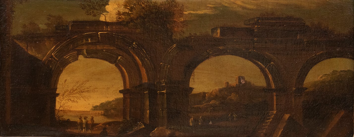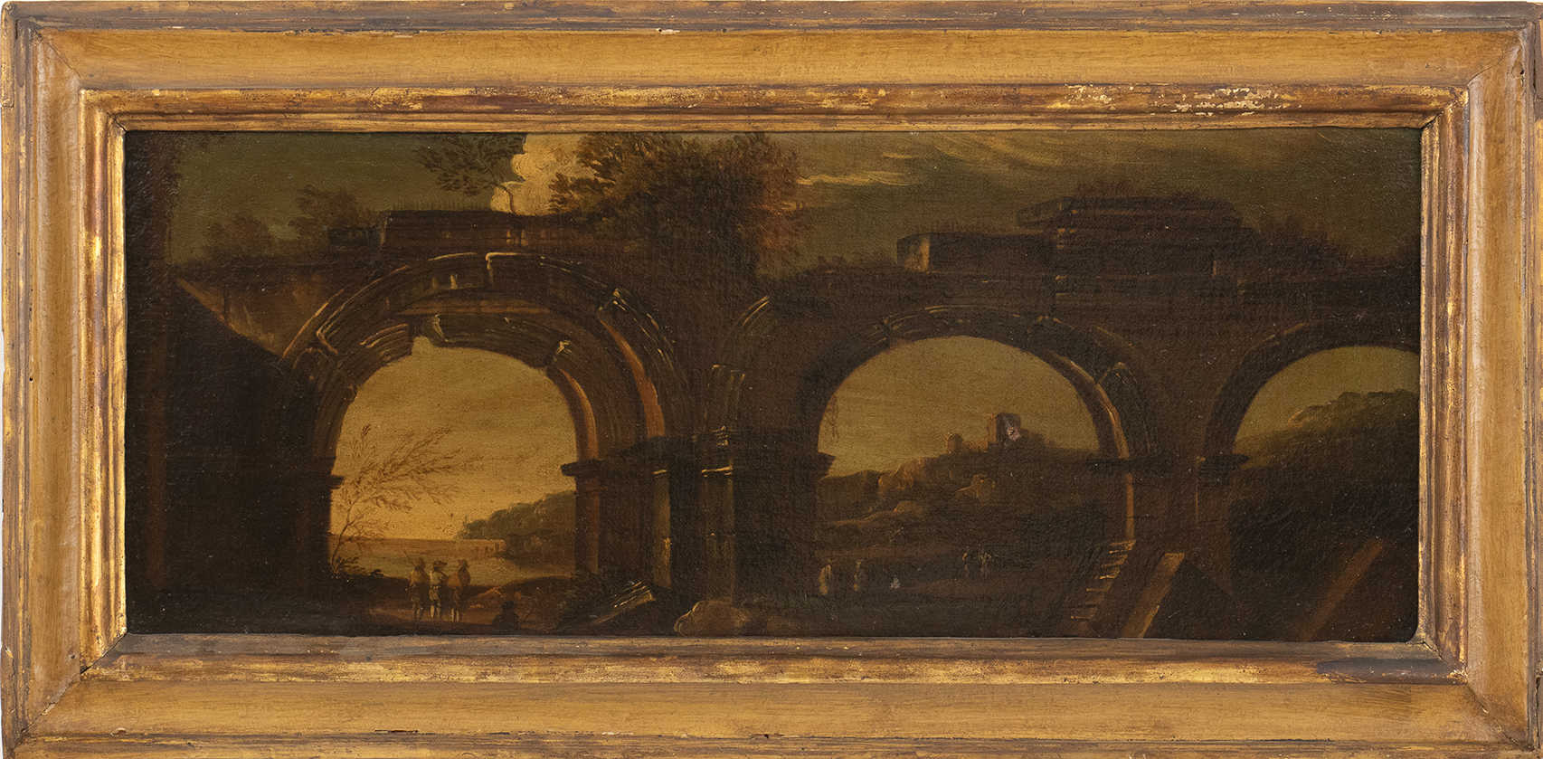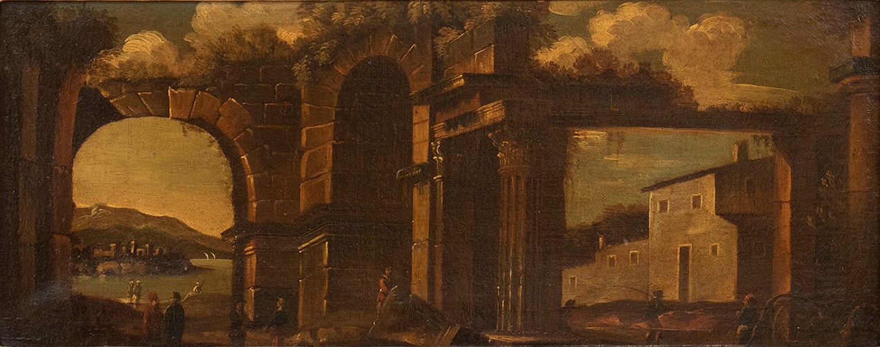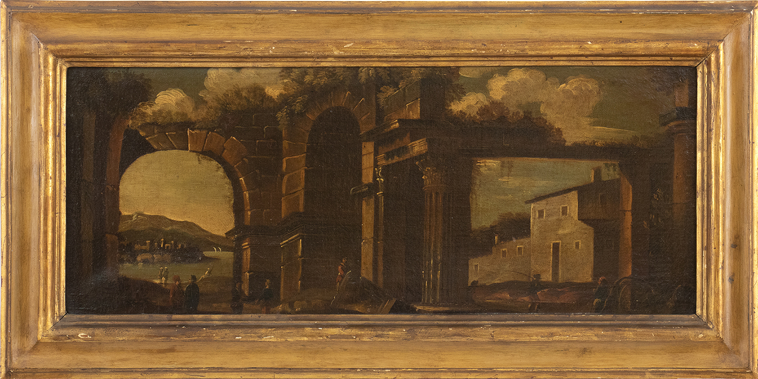 Capriccio con ruderi, edifici e figure - Capriccio con acquedotto e figure. Coppia di sovrapporta
