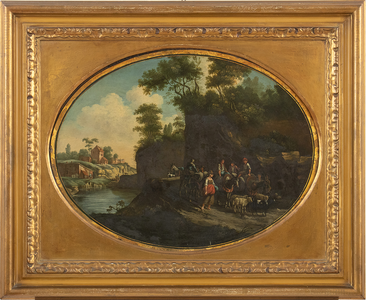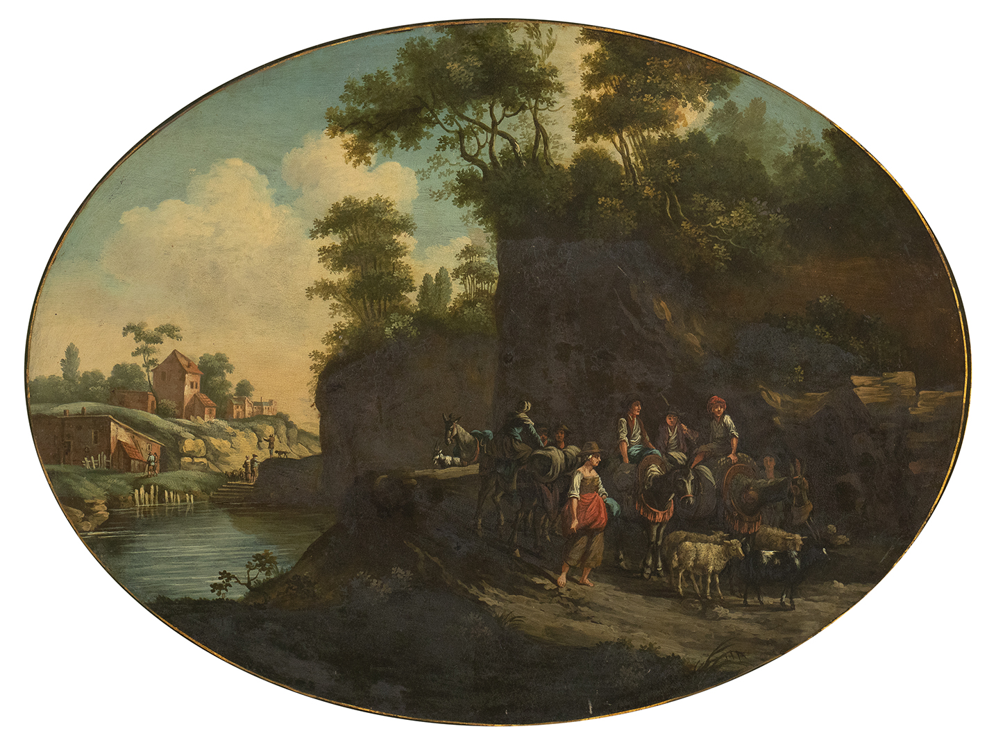Paesaggio di fantasia con gruppo di pastori, armenti e corso d'acqua