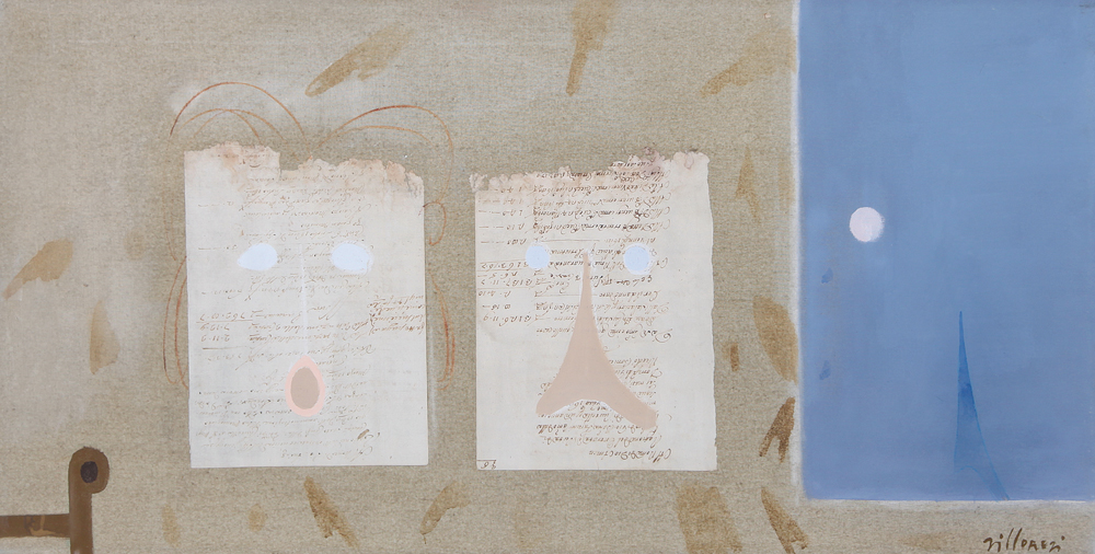 FRANCO VILLORESI Citta' di Castello 1920 - Rigutino 1975 Maschere coniugali con piccola luna Polimaterico su tela cm. 50x100, firma in basso a destra, firma e titolo al retro, dichiarazione d'autenticità della Telemarket (BS) su foto e certificato allegato.
